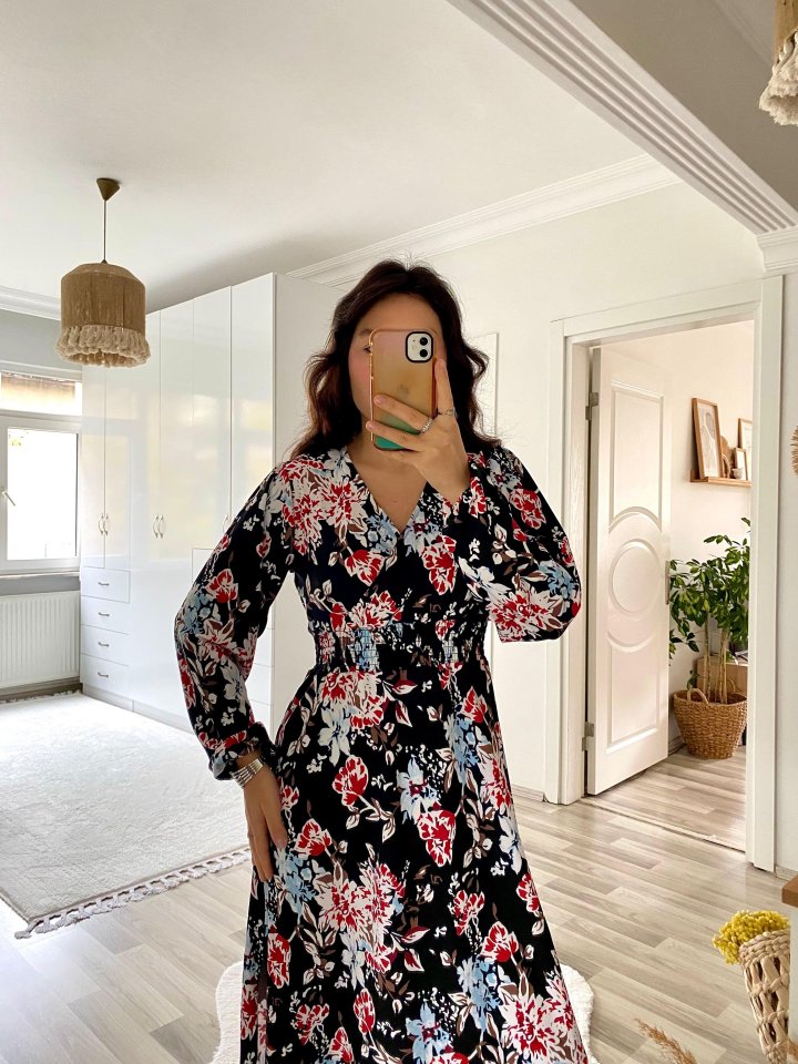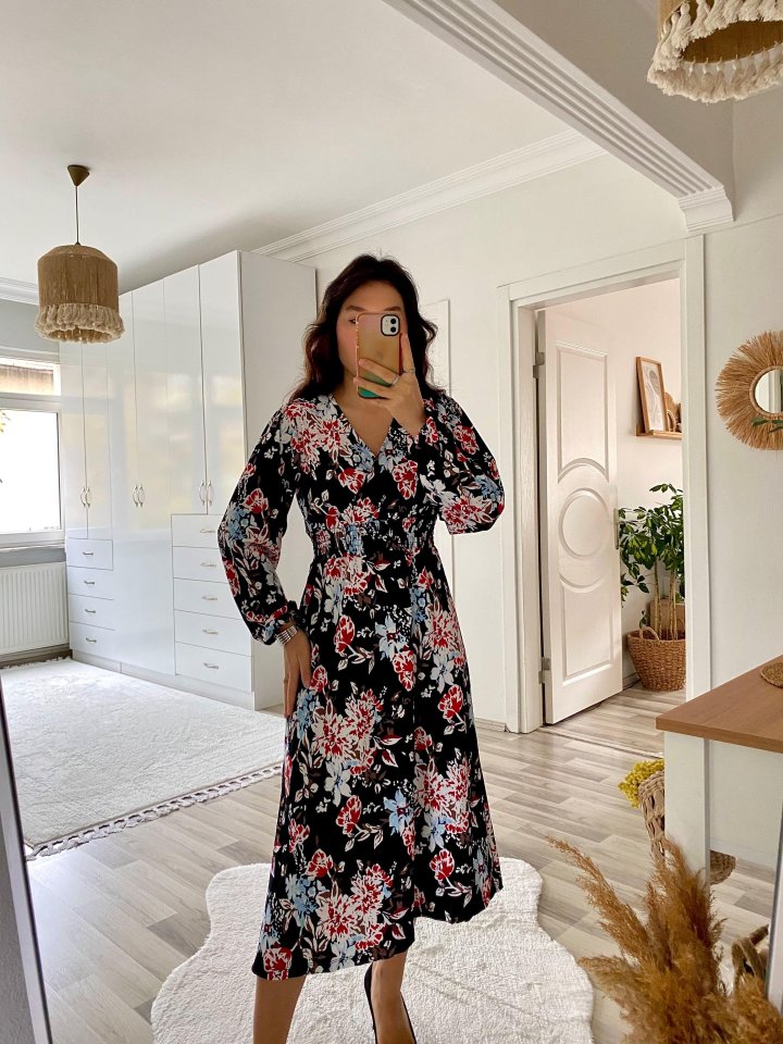 Kadın Uzun Kollu Kruvaze Yaka Beli Lastikli Yandan Yırtmaçlı Desenli Dalgıç Elbise