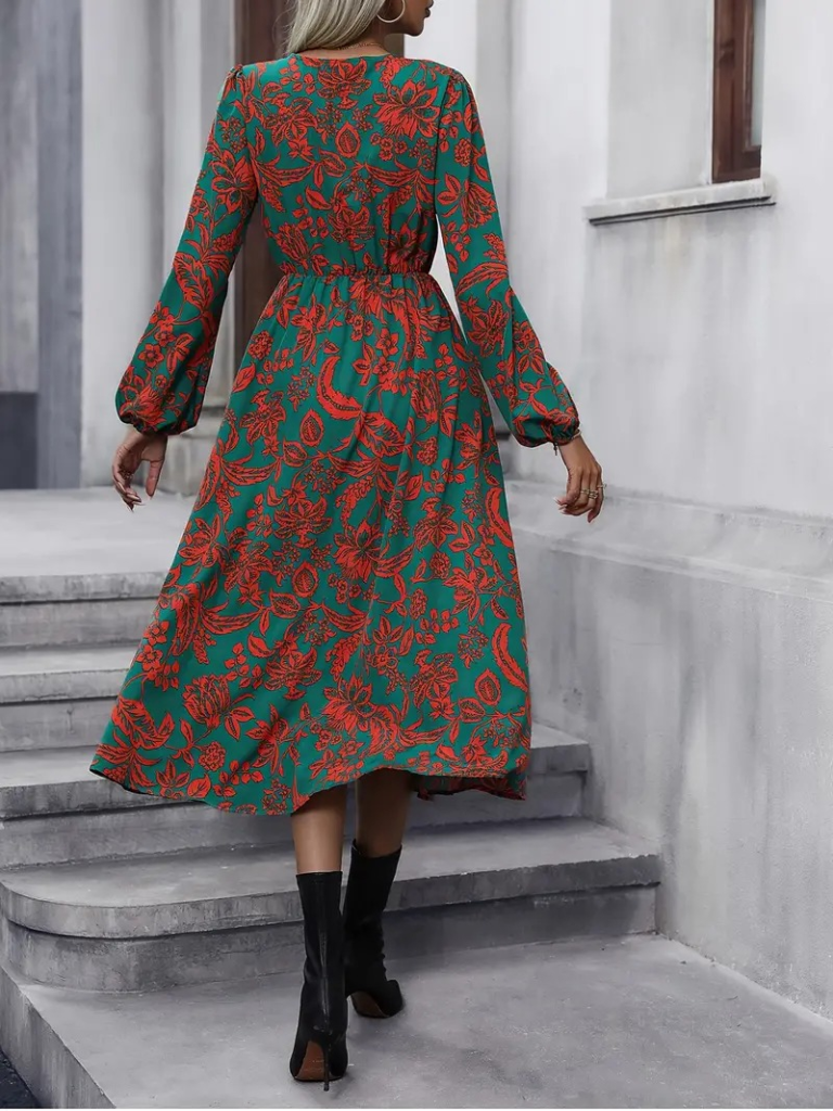 Kadın Uzun Kollu Kruvaze Yaka çiçek Baskılı Yırtmaçlı Midi Süprem Elbise