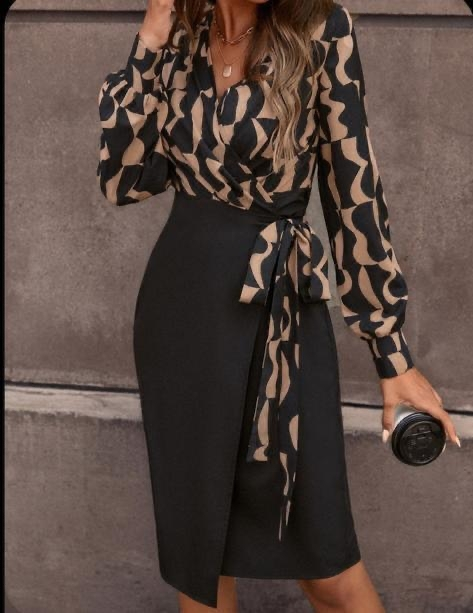 Kadın Uzun Kollu Kruvaze Yaka Dijital Baskılı Fiyonk Detay Atlas Kumaş Elbise