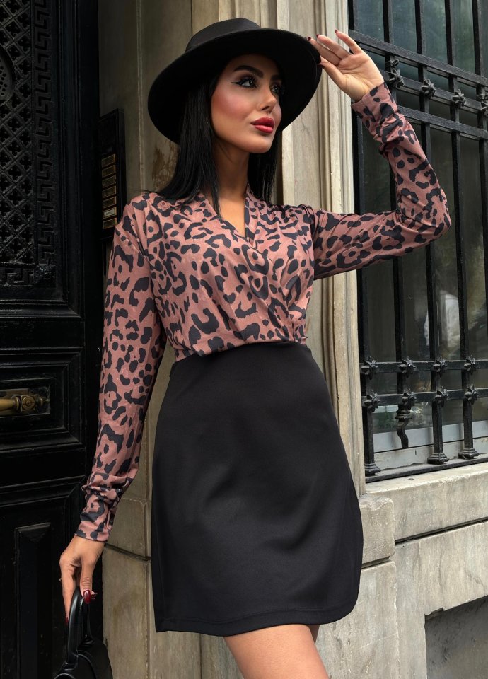 Kadın Uzun Kollu Kruvaze Yaka Krep Mini Boy Elbise