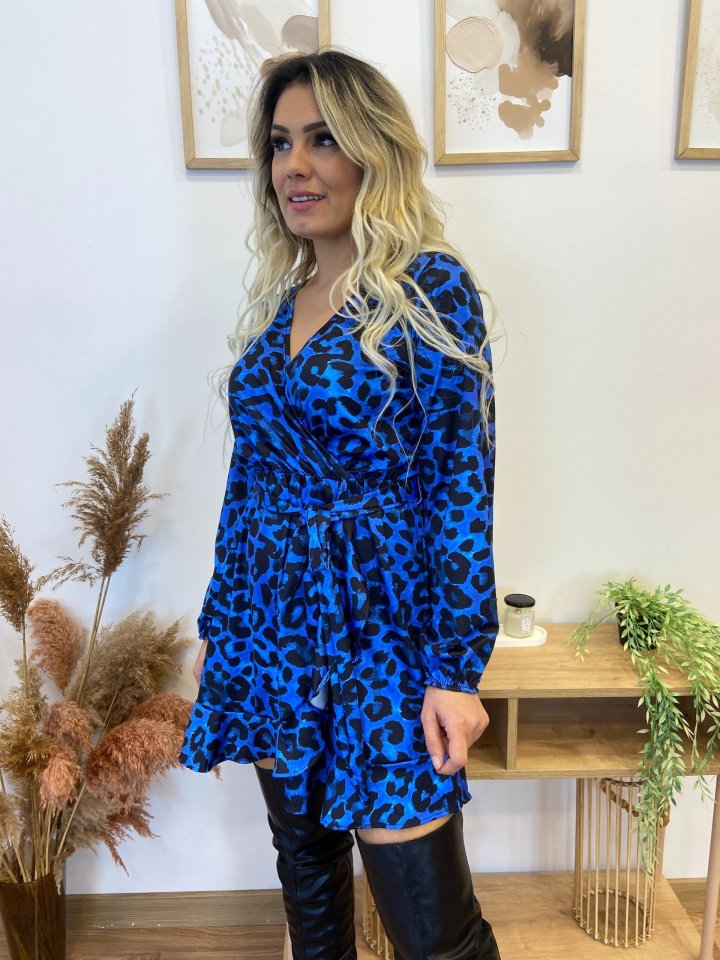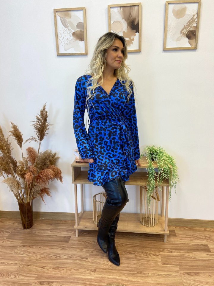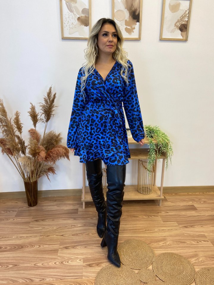 Kadın Uzun Kollu Kruvaze Yaka Kuşaklı Leopar Kısa Dalgıç Elbise