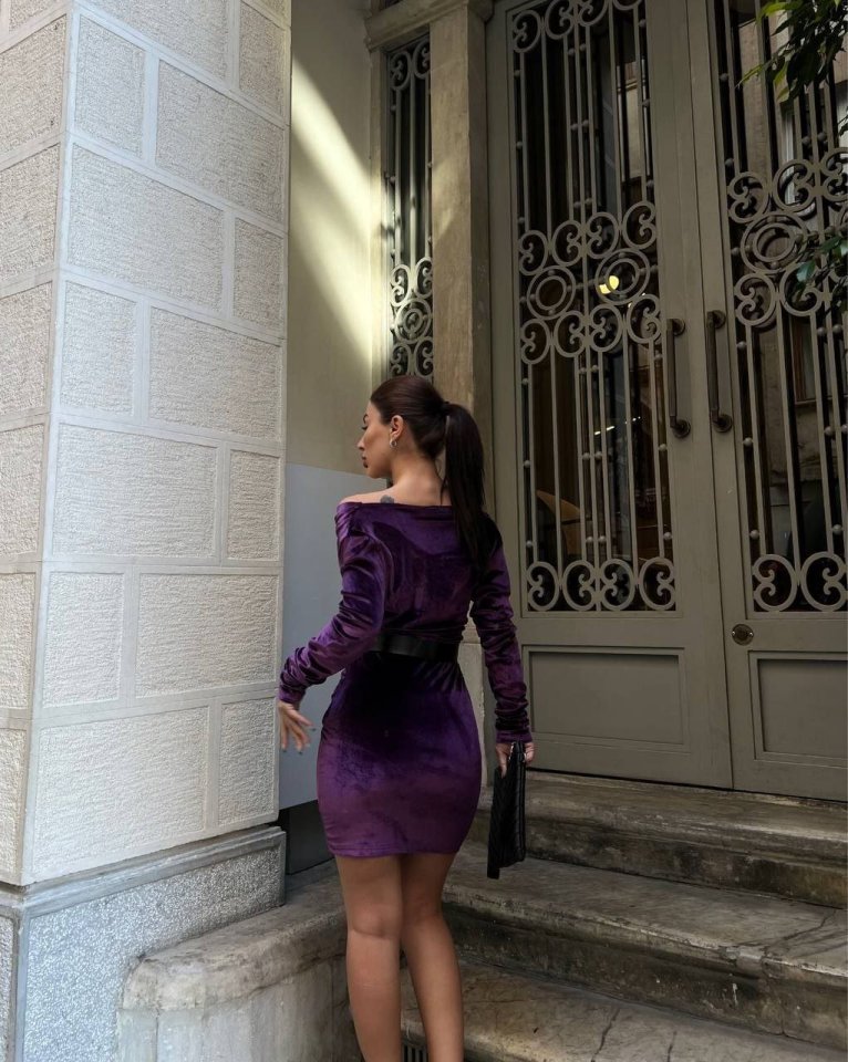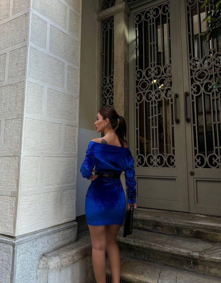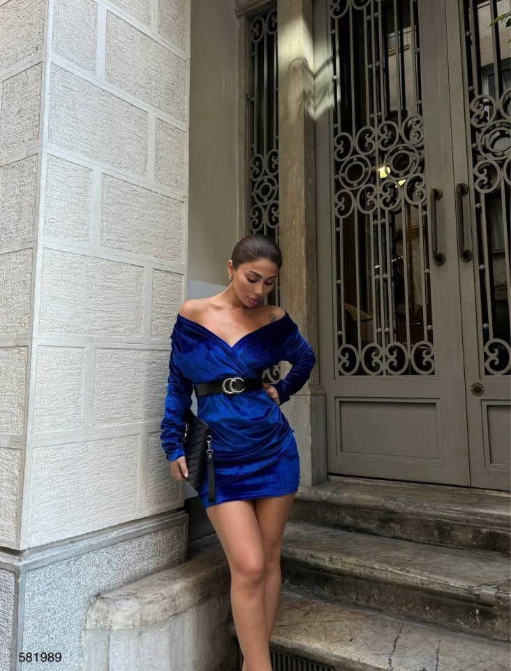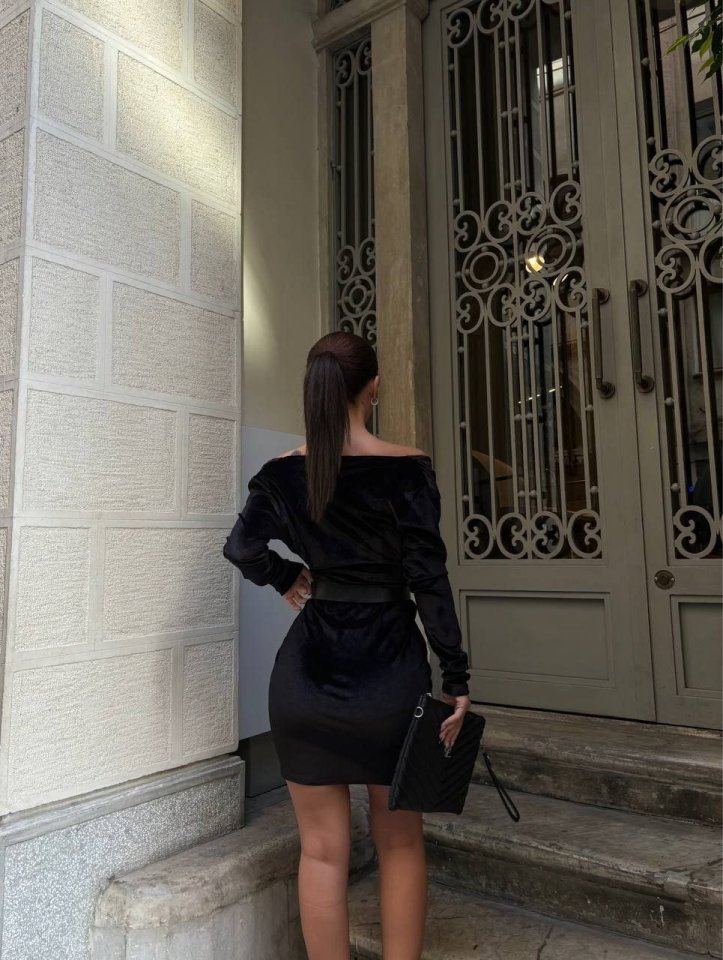 Kadın Uzun Kollu Kruvaze Yaka Omuz Dekolteli Kemer Dahil Mini Kadife Elbise