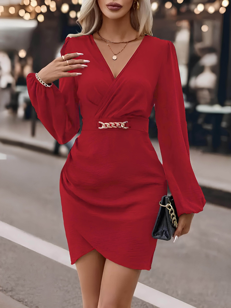 Kadın Uzun Kollu Kruvaze Yaka önden Asimetrik Detay Kısa Krep Elbise