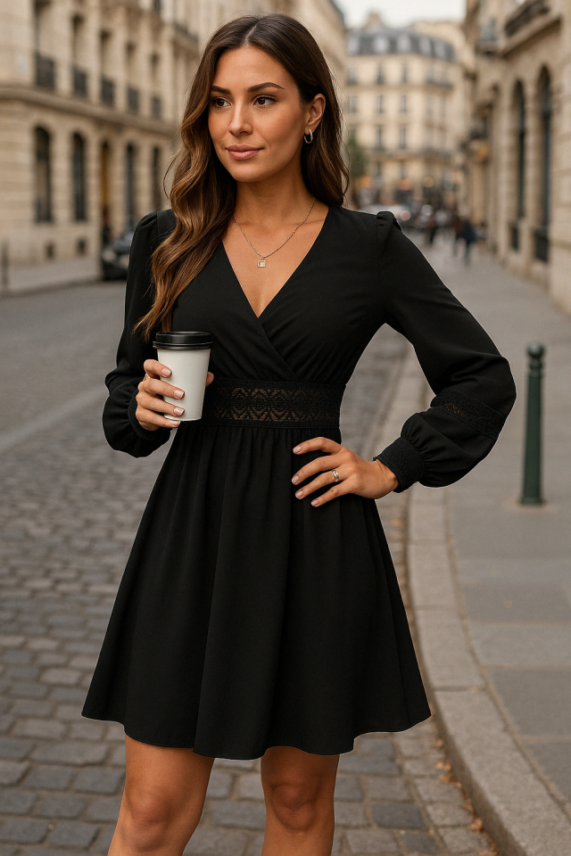 Kadın Uzun Kollu Kruvaze Yakalı Dantelli Fermuar Detaylı Kısa Ithal Krep Elbise