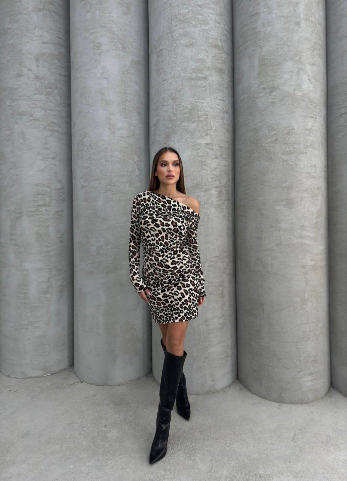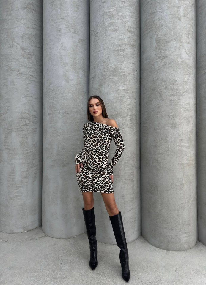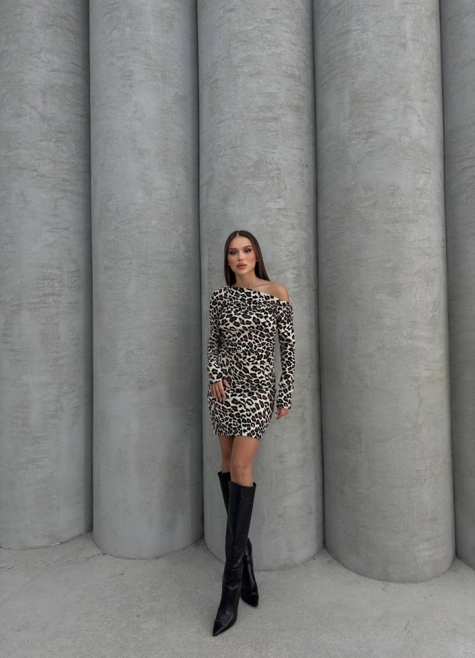 Kadın Uzun Kollu Leopar Desen Omuz Dekolteli Mini Elbise