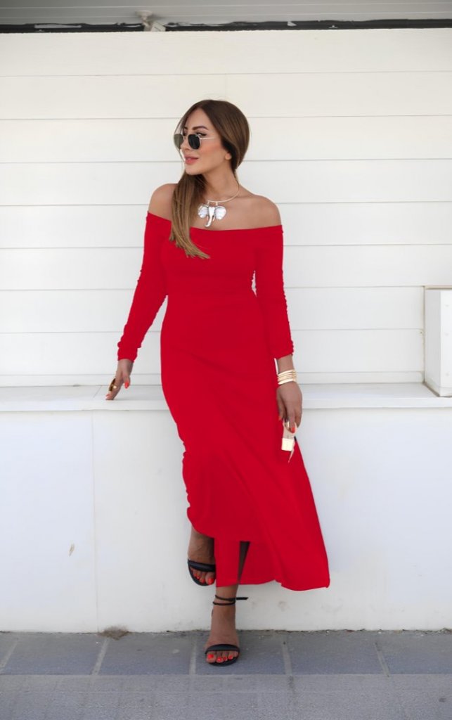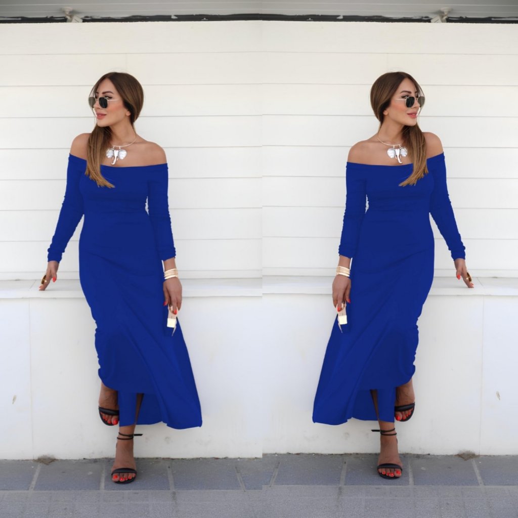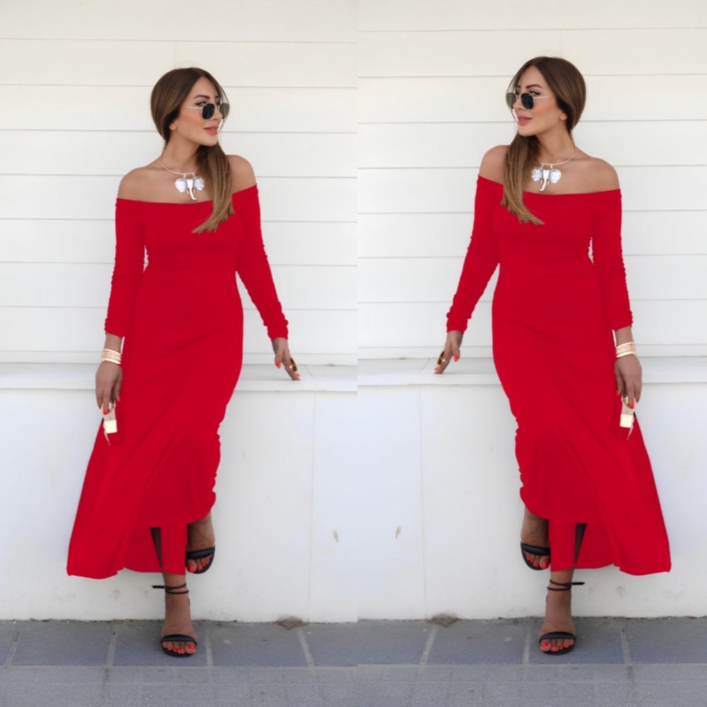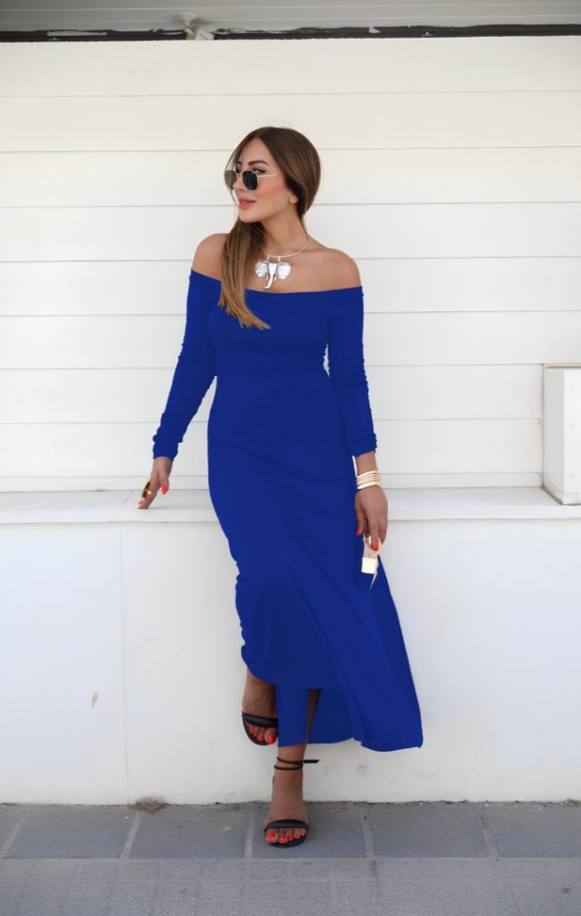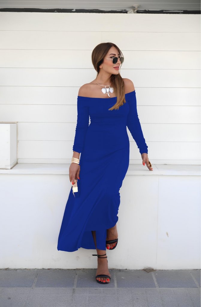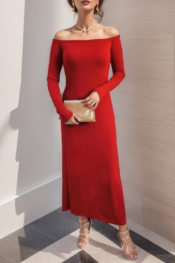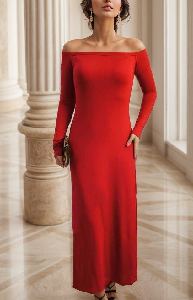 Kadın Uzun Kollu Madonna Yaka Tam Boy Viskon Elbise