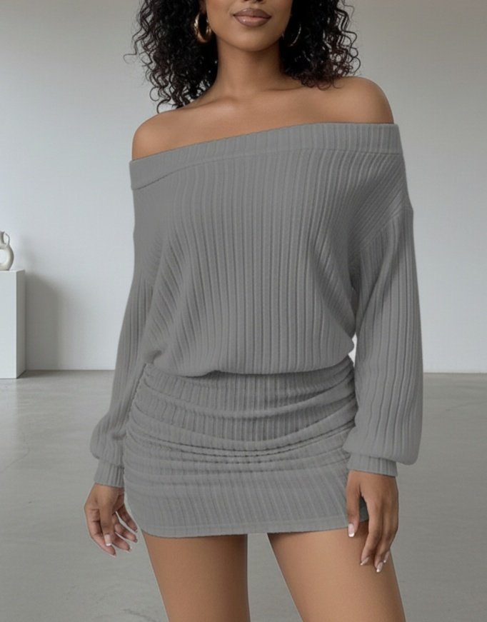 Kadın Uzun Kollu Madonna Yaka Yanlardan Büzgülü şardonlu Kaşkorse Mini Elbise