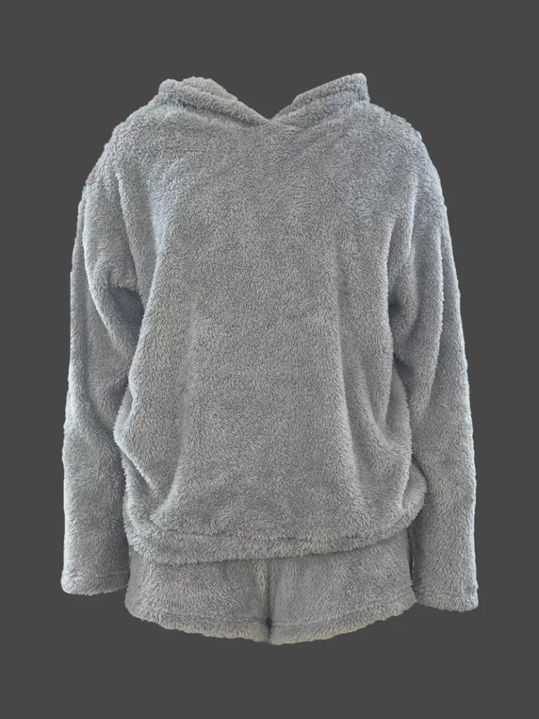 Kadın Uzun Kollu Meow Kedi Nakışlı Kapşonlu Peluş Sweat Ve Short Ikili Takım