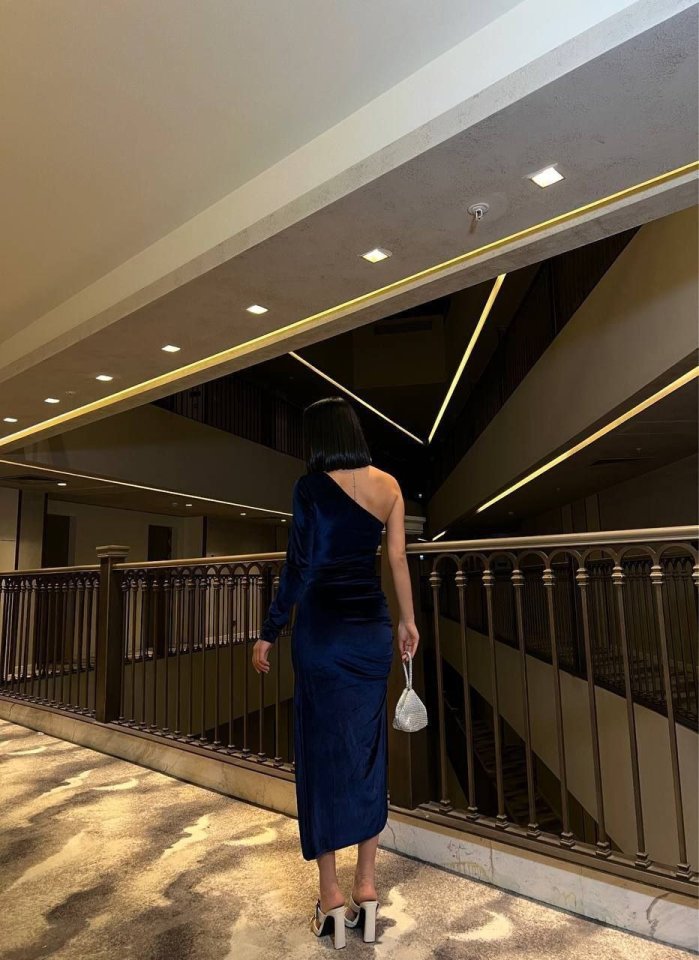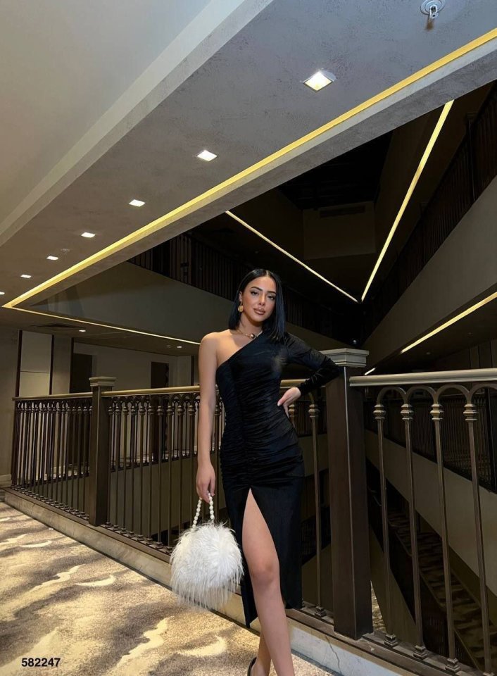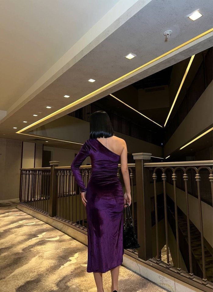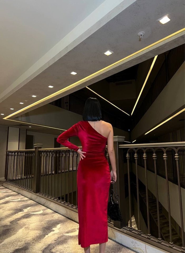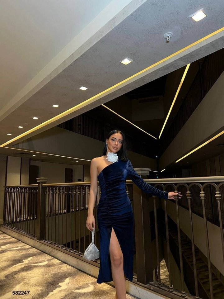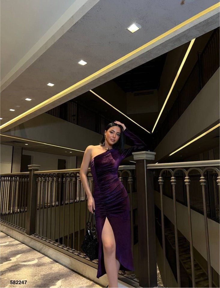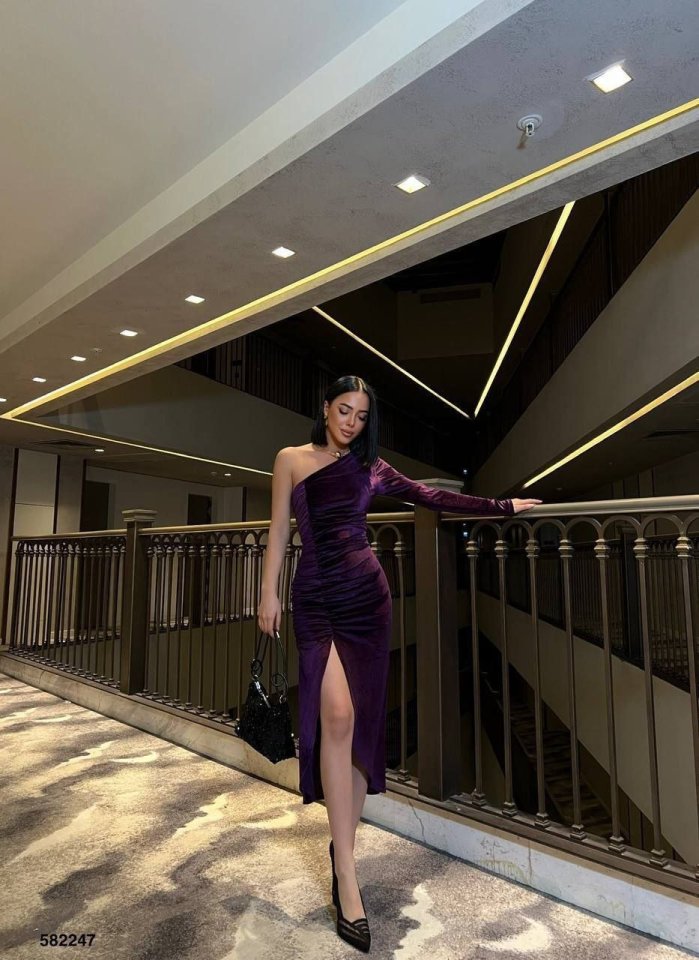 Kadın Uzun Kollu Omuz Dekolteli Büzgü Ve Asimetrik Yırtmaç Detay Elbise