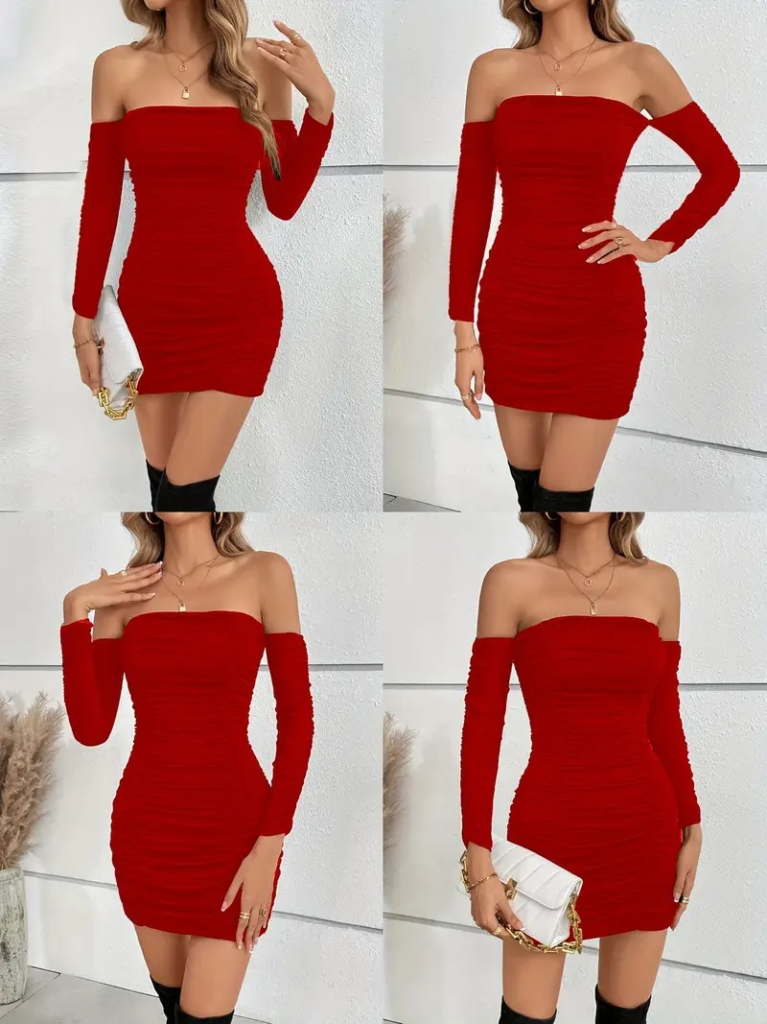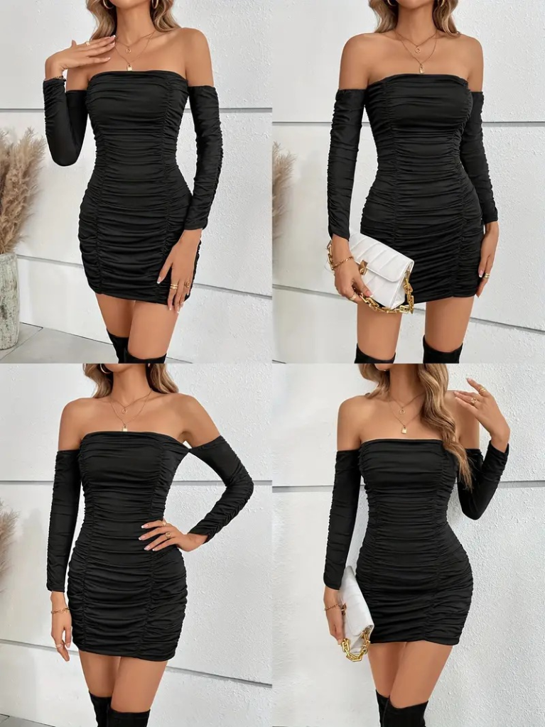 Kadın Uzun Kollu Omuzlardan Açık Takma Kollu Büzgülü Sandy Kısa Elbise