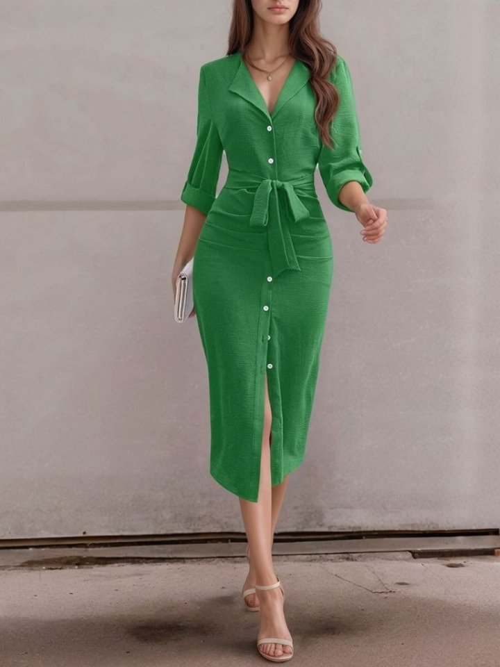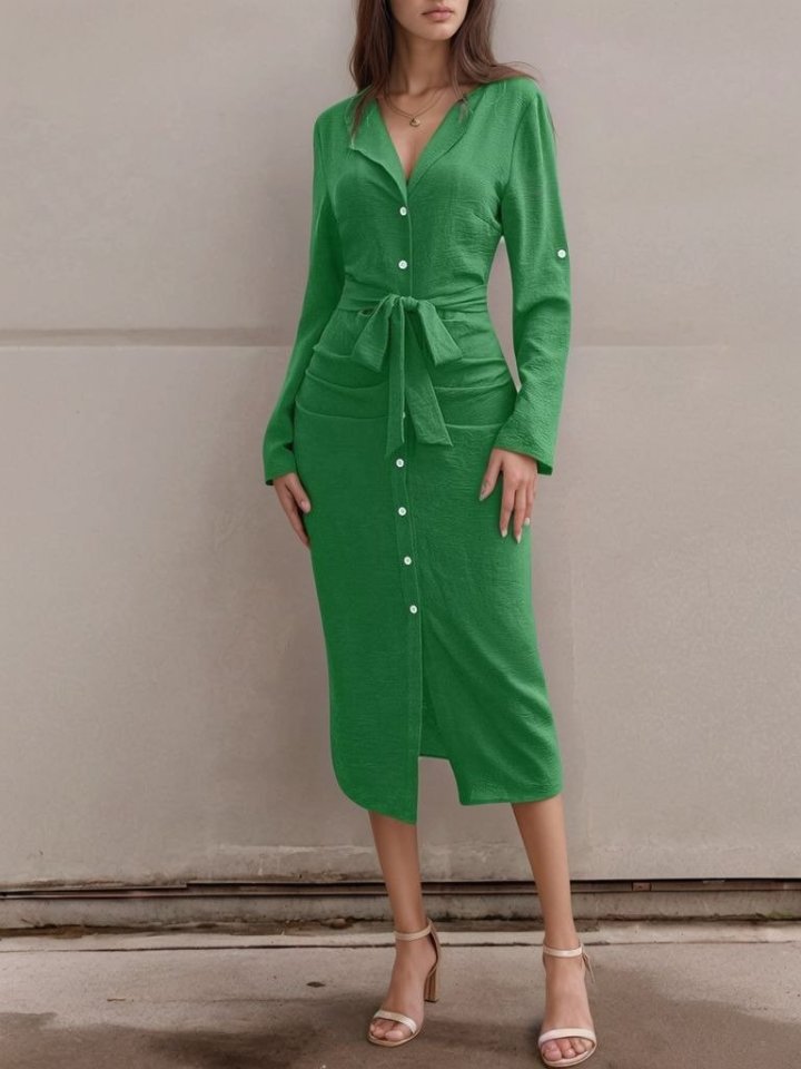 Kadın Uzun Kollu önden Düğmeli Beli Kuşaklı Aerobin Midi Elbise