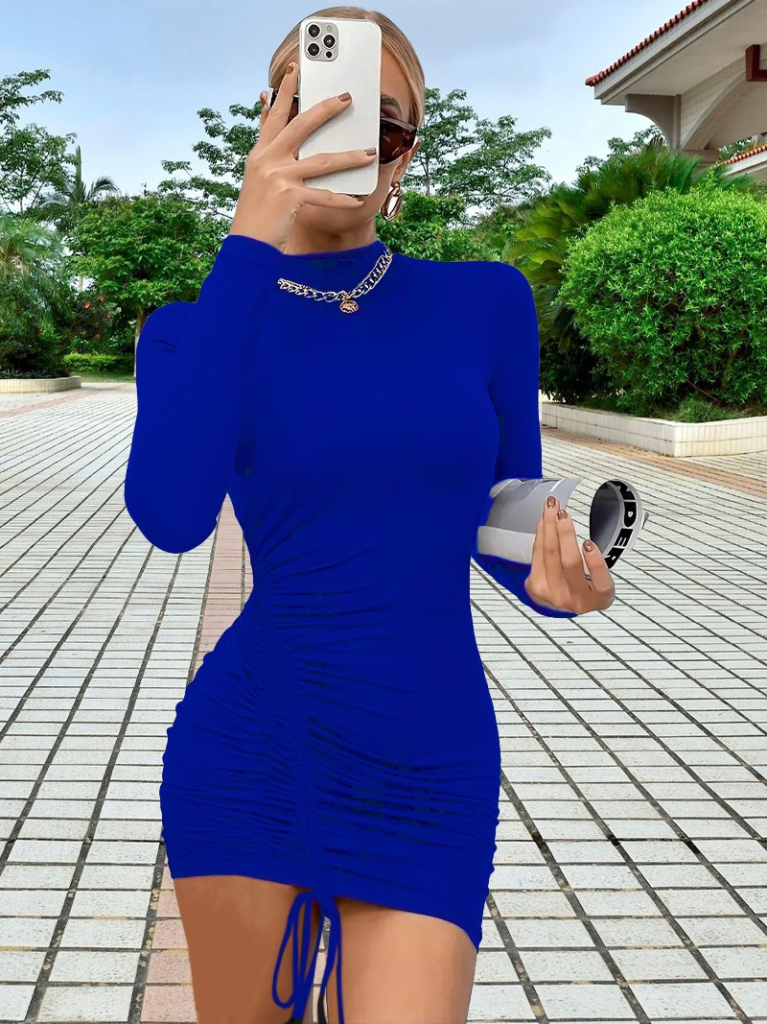 Kadın Uzun Kollu Sağ Belden Sol Etek Ucuna Doğru Hafif çapraz Büzgülü Sandy Mini Boy Elbise