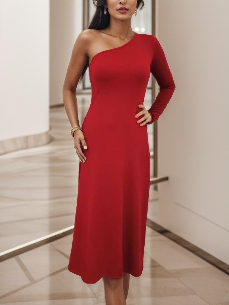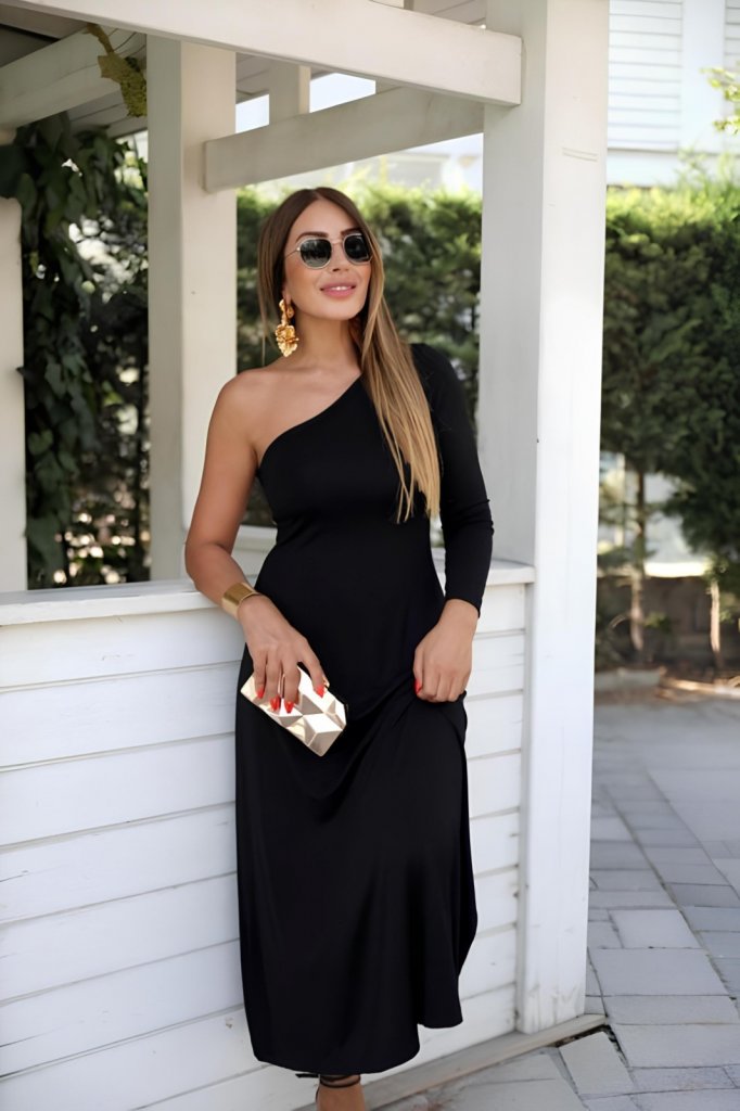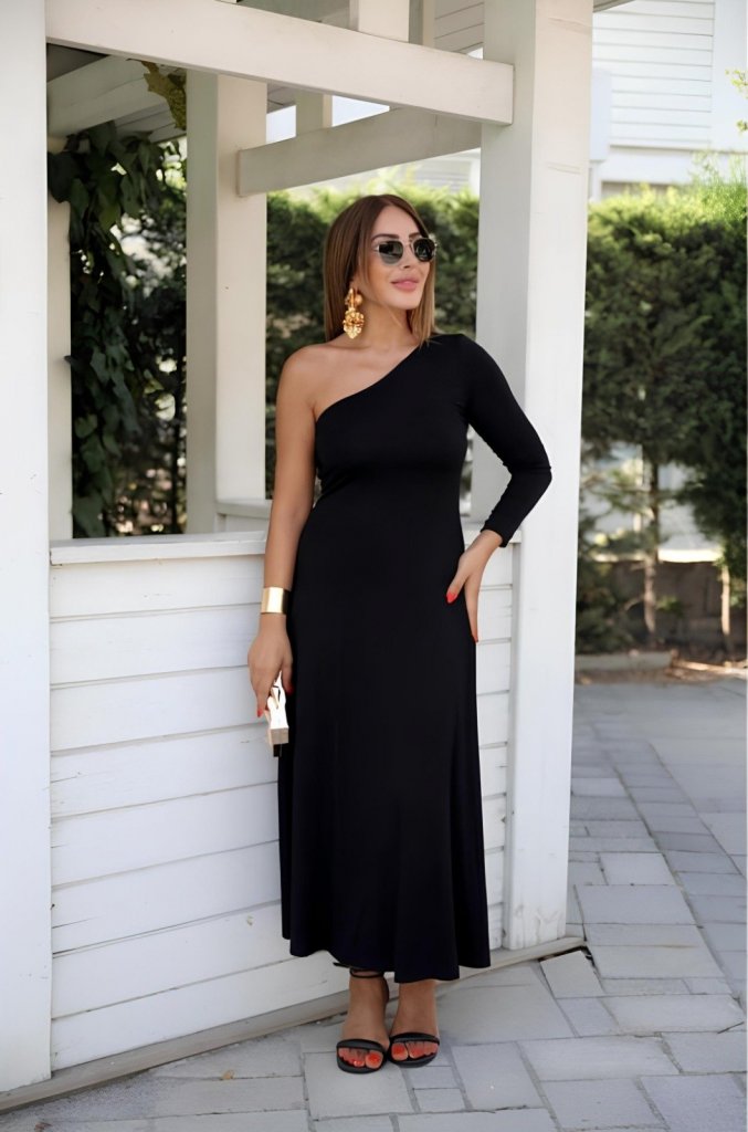 Kadın Uzun Kollu Tek Omuz Detay Krep Elbise