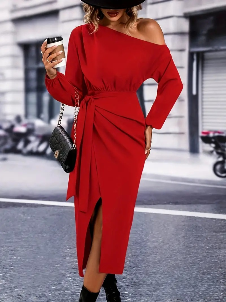 Kadın Uzun Kollu Tek Omuzu Açık Belden Kuşaklı önden çapraz Detaylı Krep Elbise