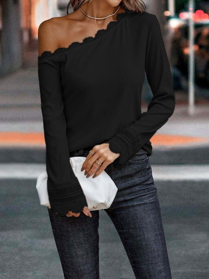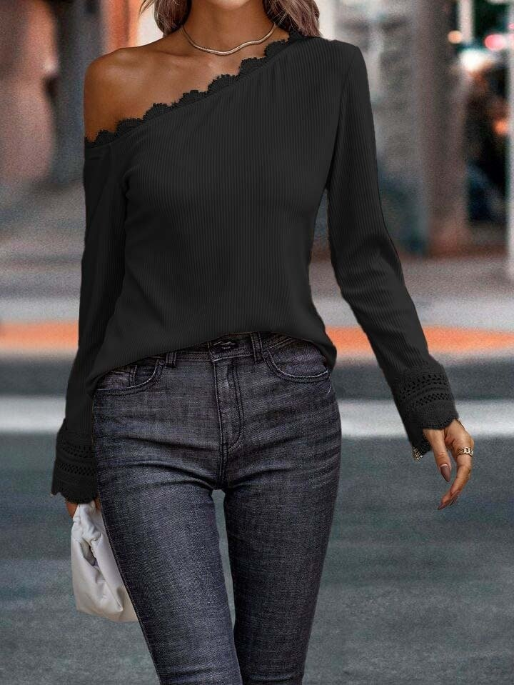 Kadın Uzun Kollu Tek Omuzu Açık Dantelli Burgu Bluz