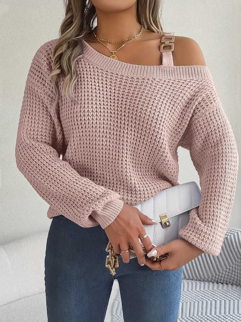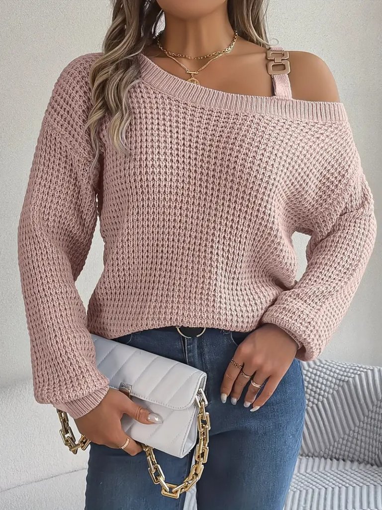 Kadın Uzun Kollu Tek Omuzu Açık Tokalı Triko Bluz