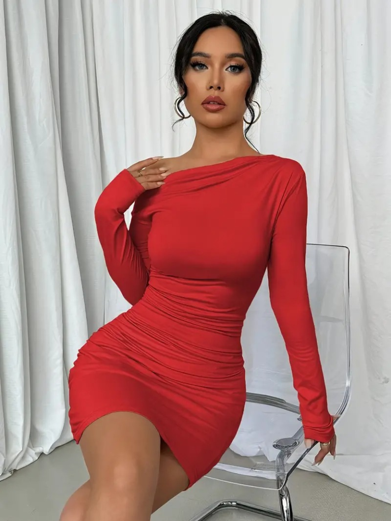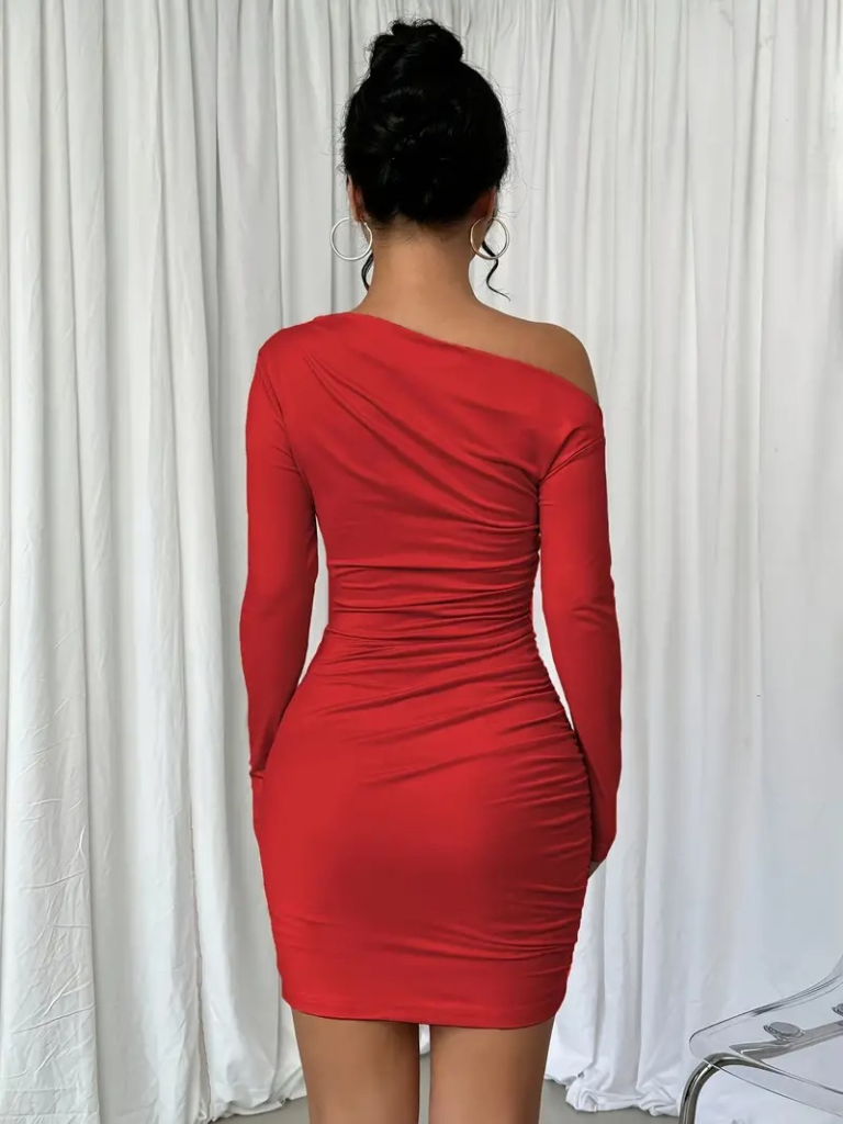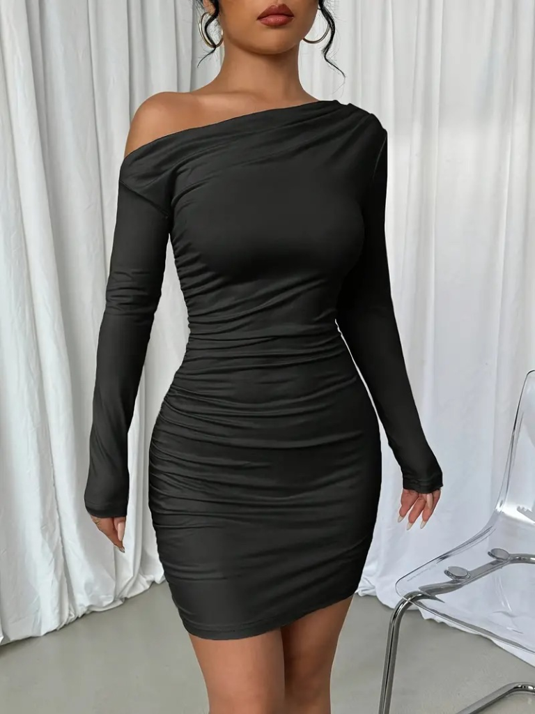 Kadın Uzun Kollu Tek Omuzu Açık Yanlardan Büzgülü Kısa Sandy Elbise