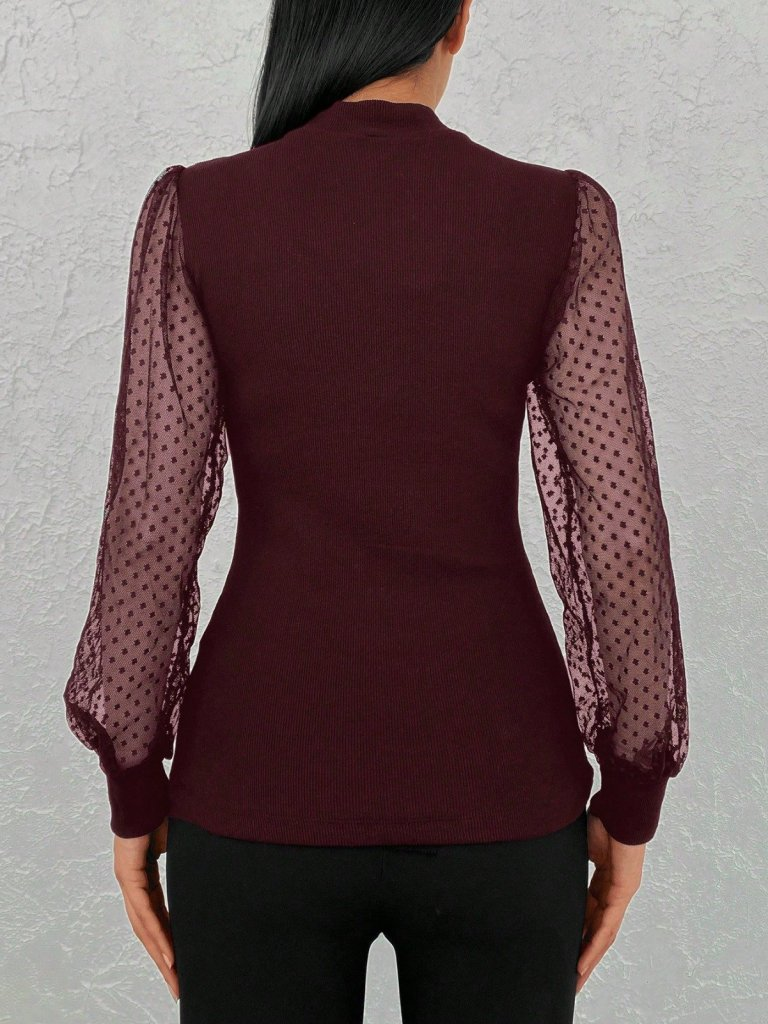 Kadın Uzun Kollu Tül Detaylı Yarım Balıkçı Yaka Kaşkorse Bluz