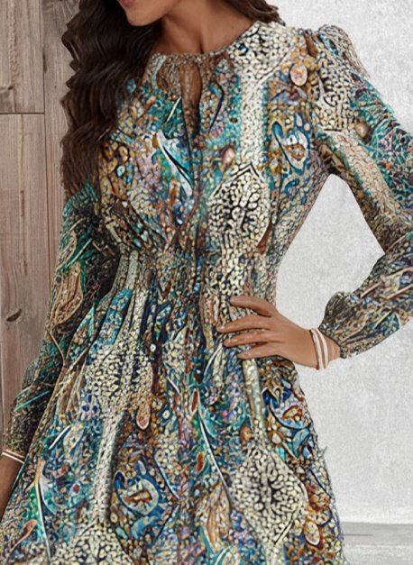 Kadın Uzun Kollu Uakadabağcıklı Beli Lastikli Desenli Uzun Süprem Elbise