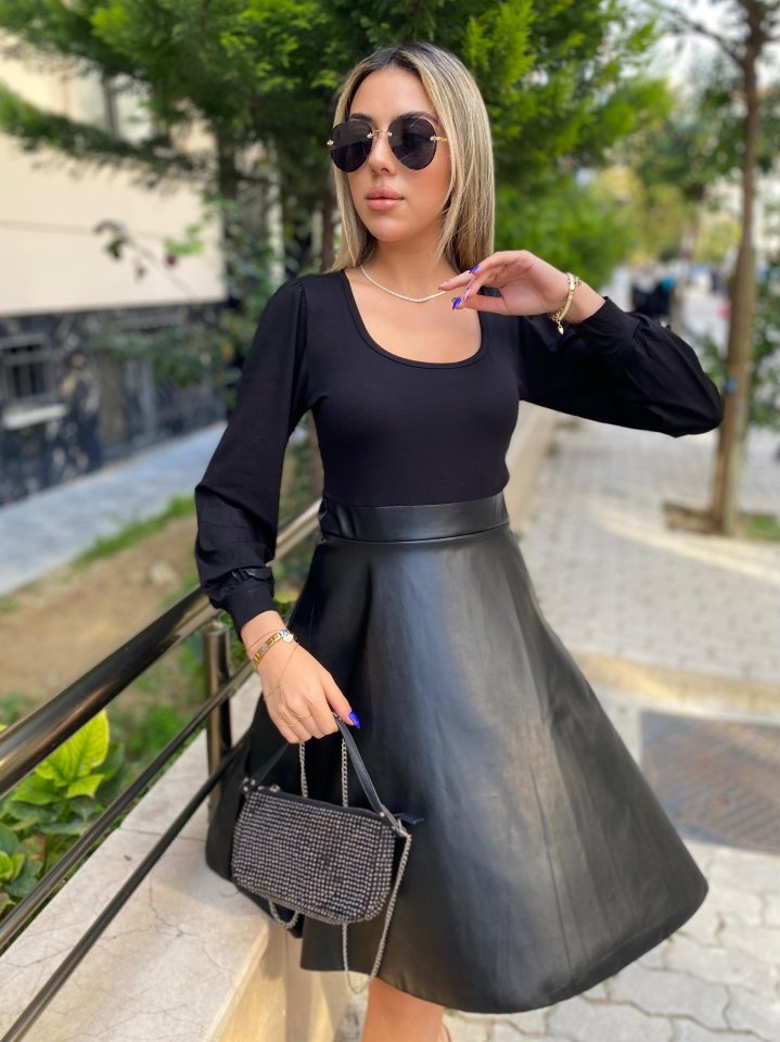 Kadın Uzun Kollu üst Viskon Alt Kloş Deri Elbise