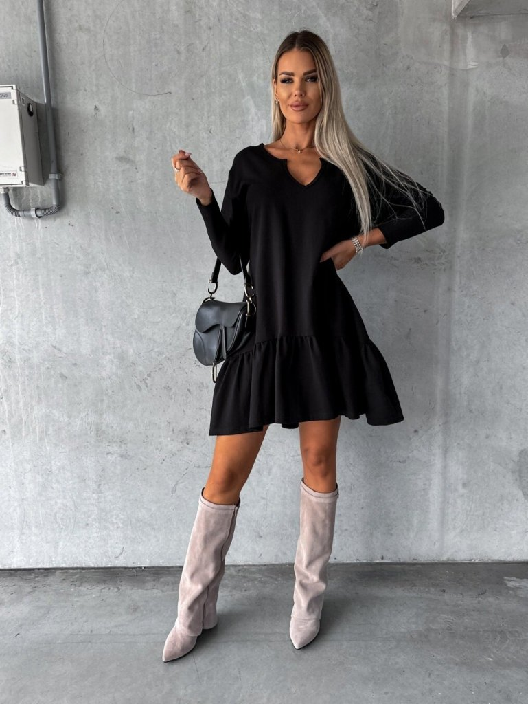 Kadın Uzun Kollu V Yaka Eteği Büzgülü Kloş Iki Iplik Mini Boy Elbise