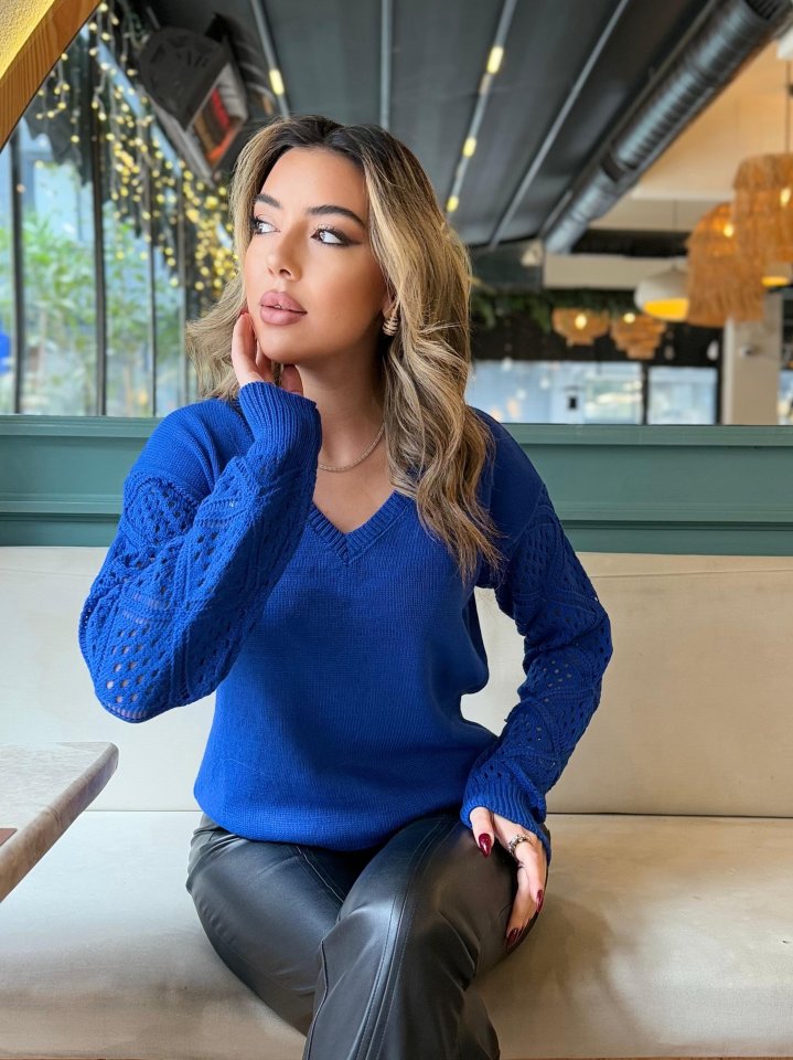 Kadın Uzun Kollu V Yaka Kol Delikli Baklava Desen Detaylı Triko Kazak