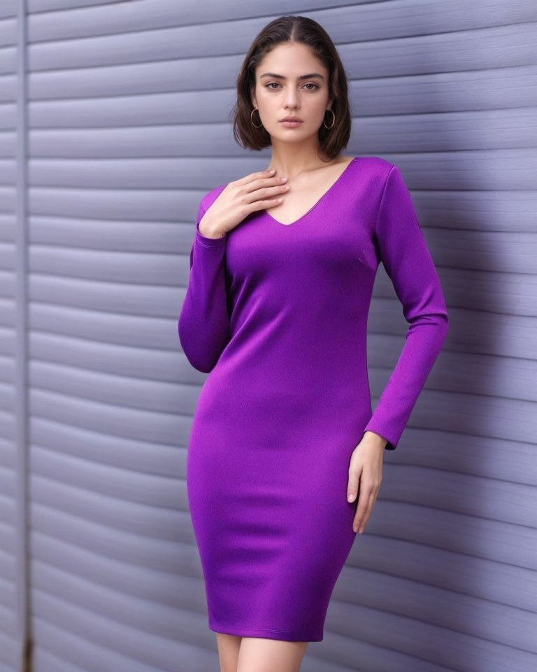 Kadın Uzun Kollu V Yaka Sırt Dekolteli Scuba Dalgıç Kumaş Mini Elbise