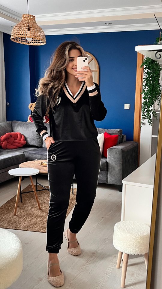 Kadın Uzun Kollu V Yaka Yakası Ve Kol Ağzı şerit Detay Armalı Kadife Takım