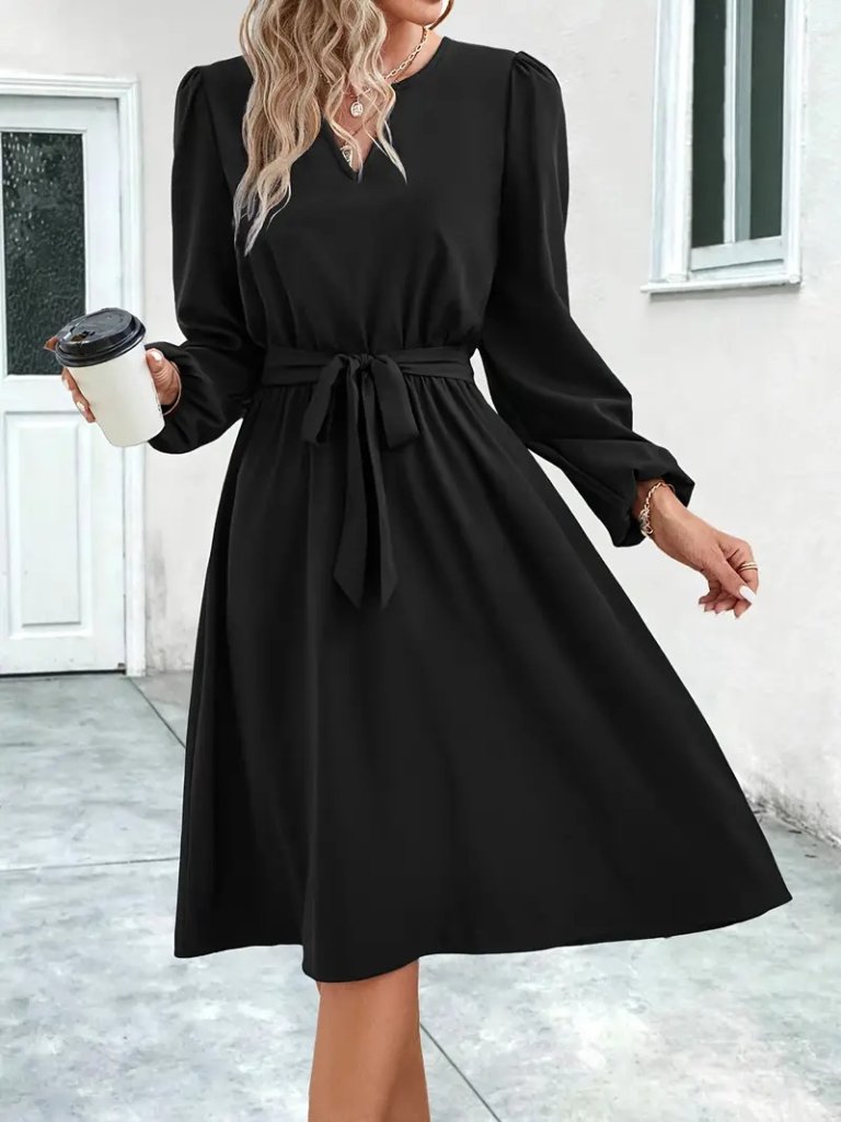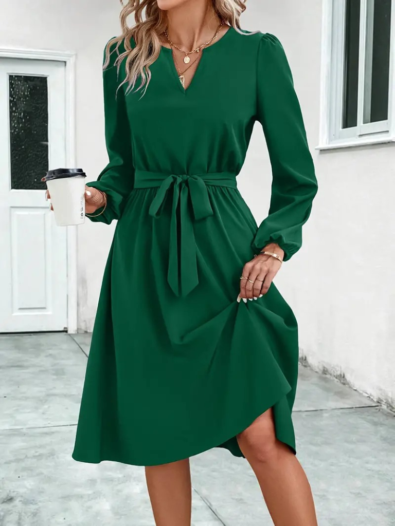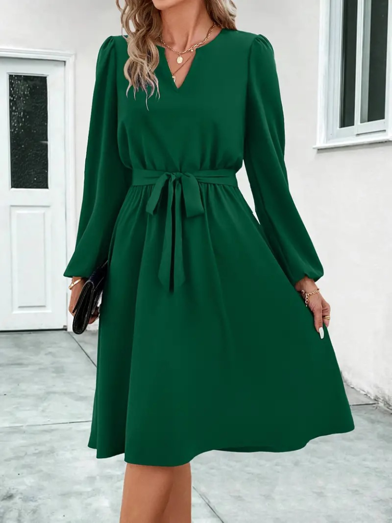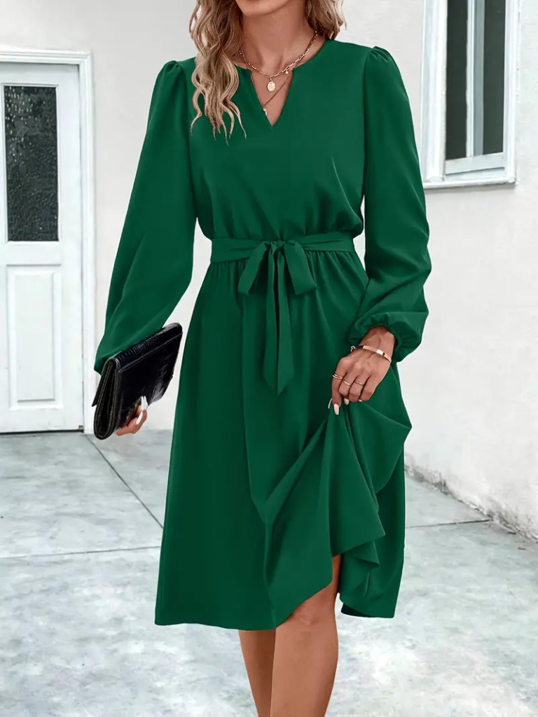 Kadın Uzun Kollu V Yakalı Belden Kuşaklı Kiloş Krep Elbise