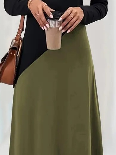 Kadın Uzun Kollu V Yakalı Blok Desenli Viskon Elbise