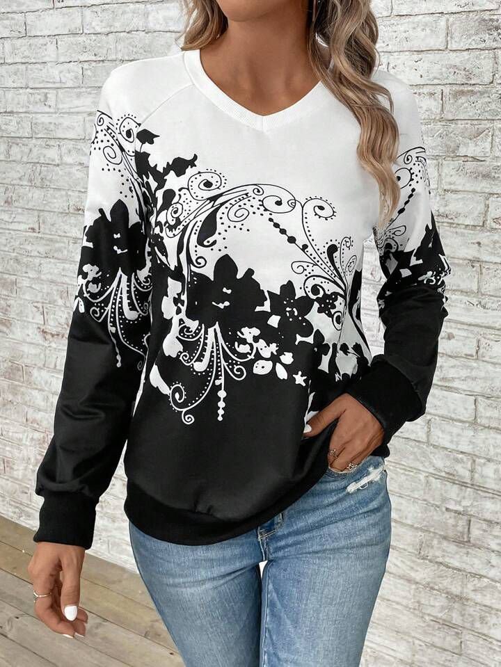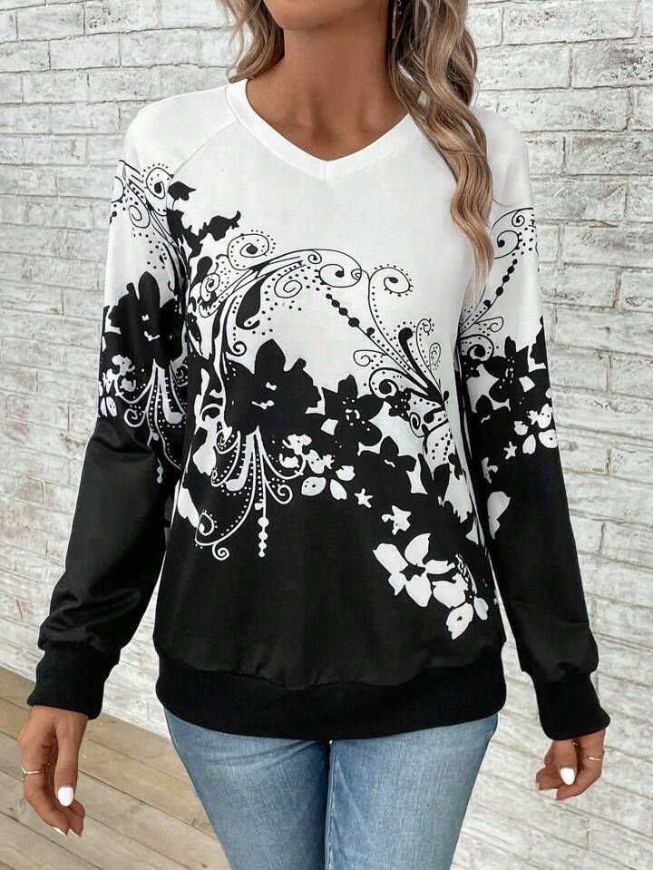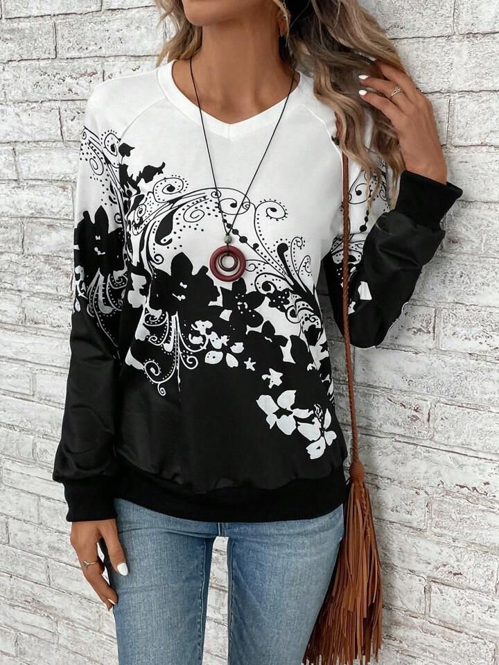 Kadın Uzun Kollu V Yakalı çiçek Baskılı şardonlu Dalgıç Bluz