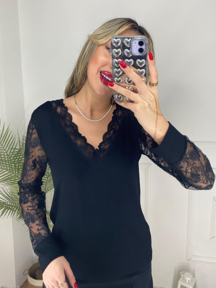 Kadın Uzun Kollu V Yakalı Dantel Detaylı Viskon Bluz
