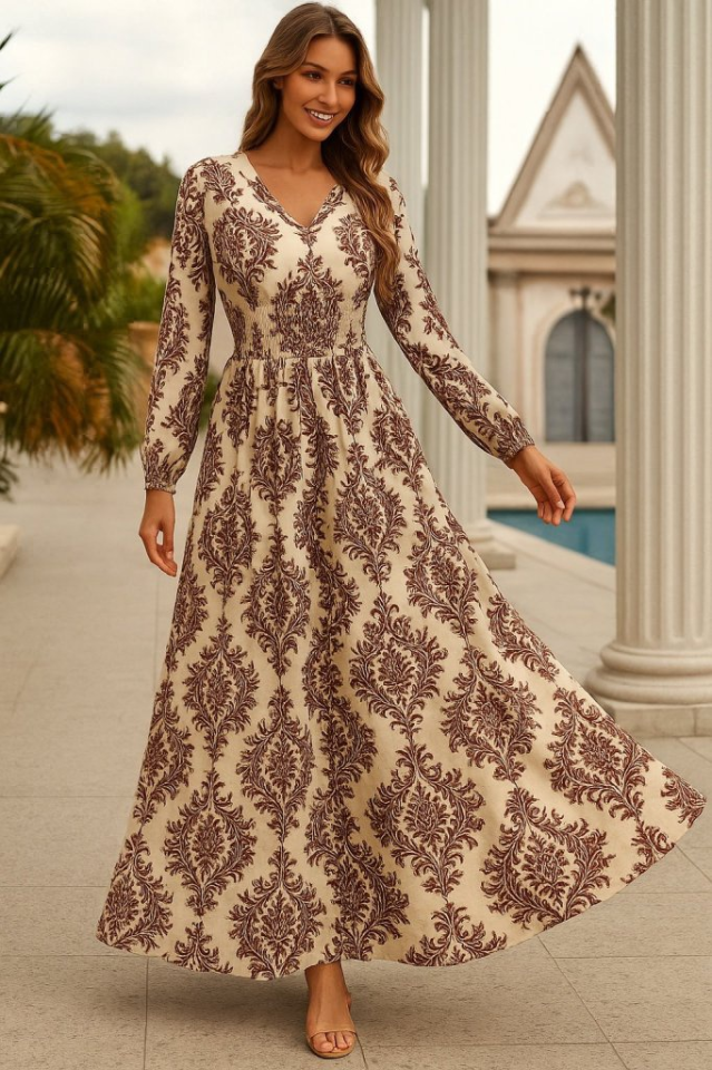 Kadın Uzun Kollu V Yakalı Desenli Süprem Elbise