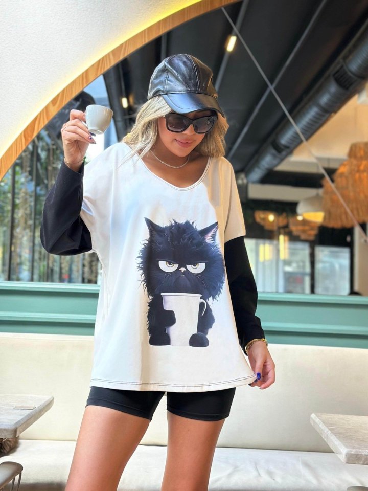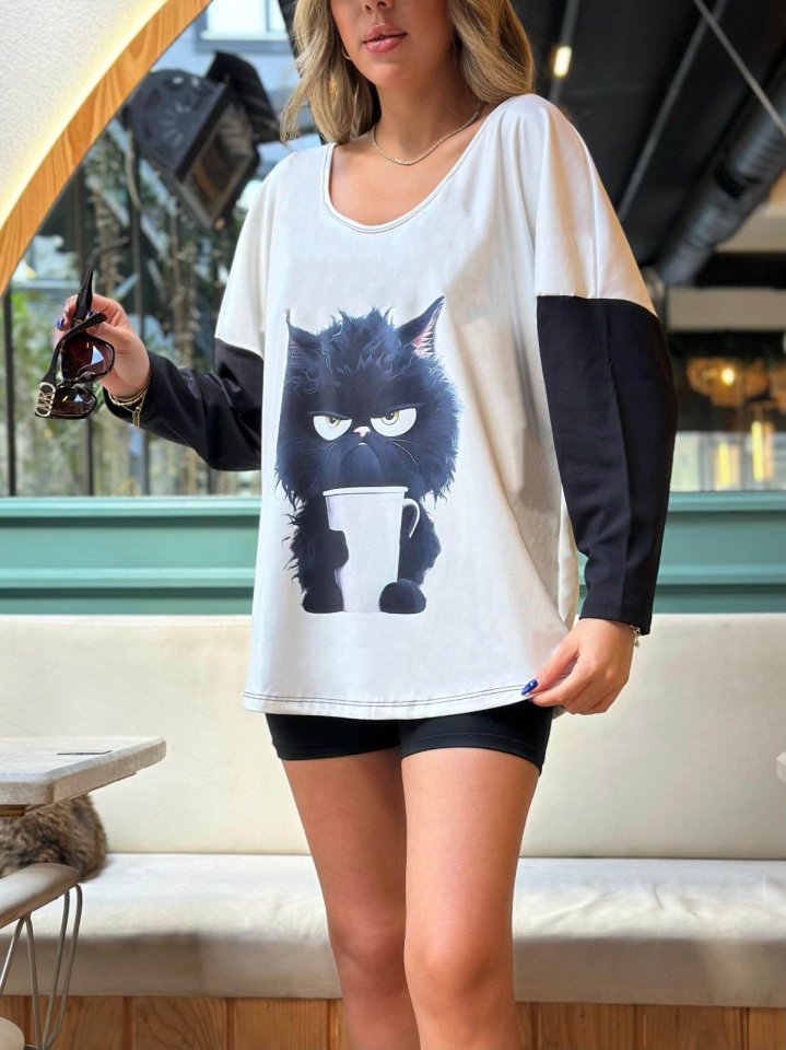 Kadın Uzun Kollu V Yakalı Kedi Baskılı şardonlu Dalgıç Bluz