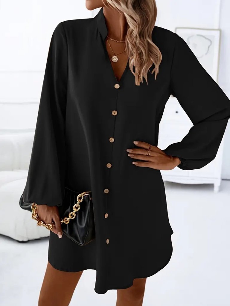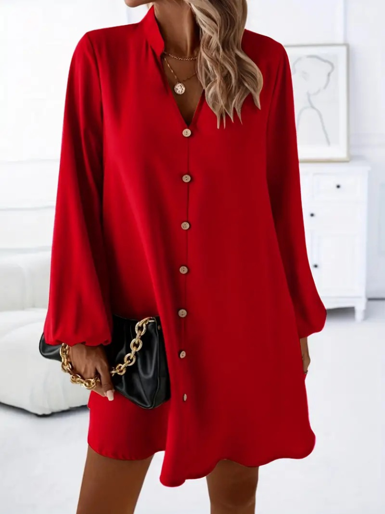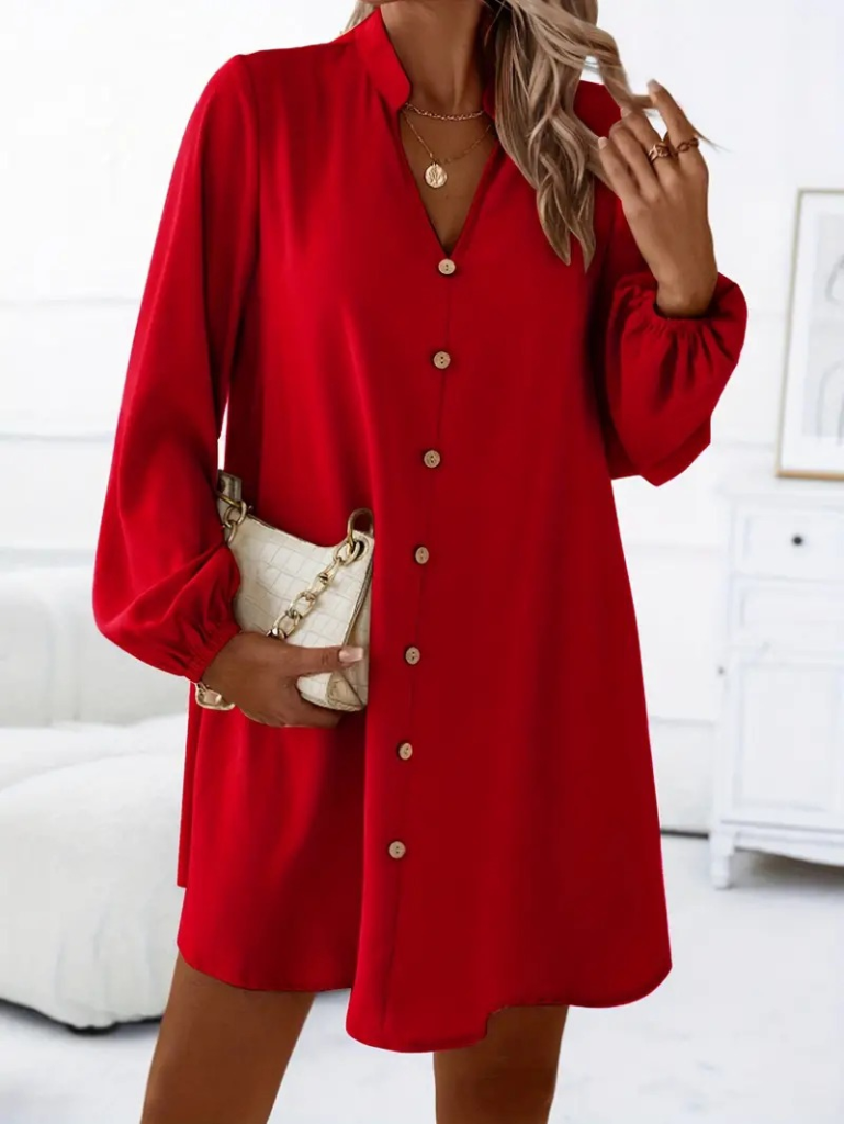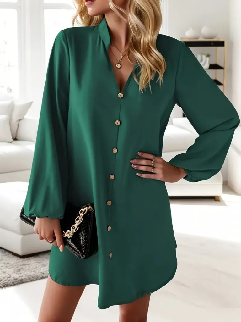 Kadın Uzun Kollu V Yakalı önden Düğmeli Kısa Sandy Elbise