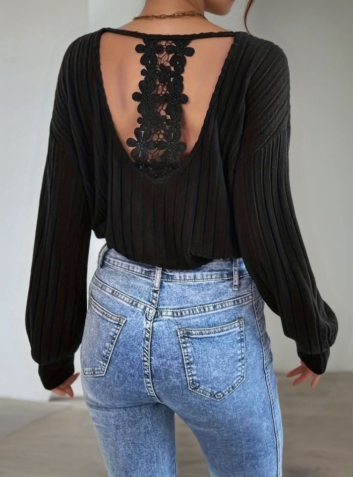 Kadın Uzun Kollu V Yakalı Pencere Sırt Dantel Detaylı Kalın Fitilli Kaşkorse Bluz