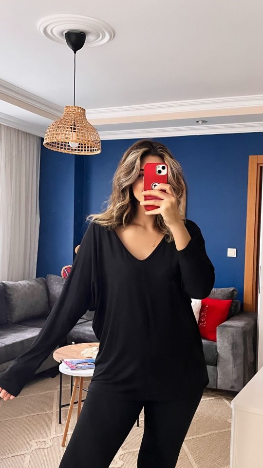 Kadın Uzun Kollu V Yakalı Salaş Viskon Bluz