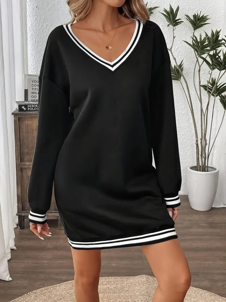 Kadın Uzun Kollu V Yakalı şerit Detaylı Kısa Viskon Iki Iplik Elbise