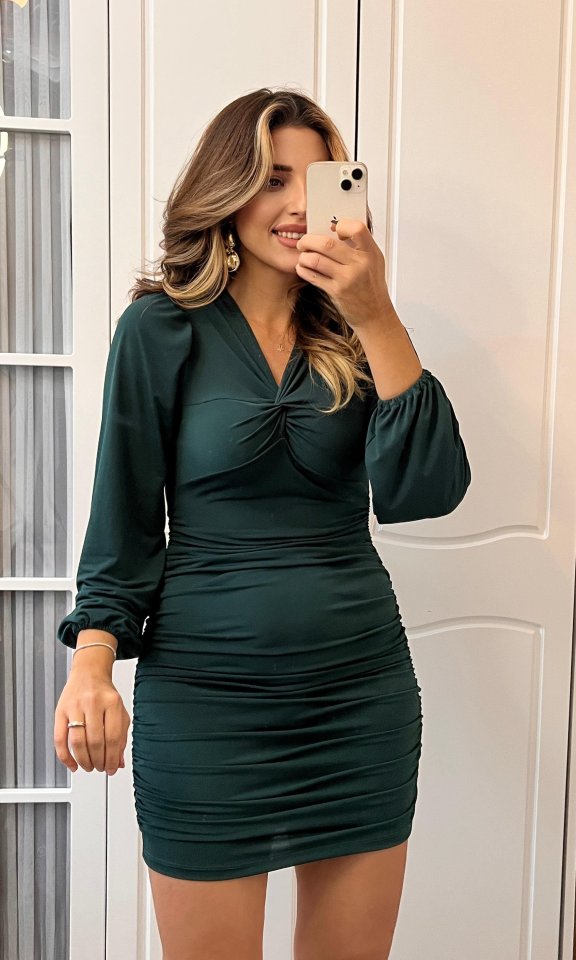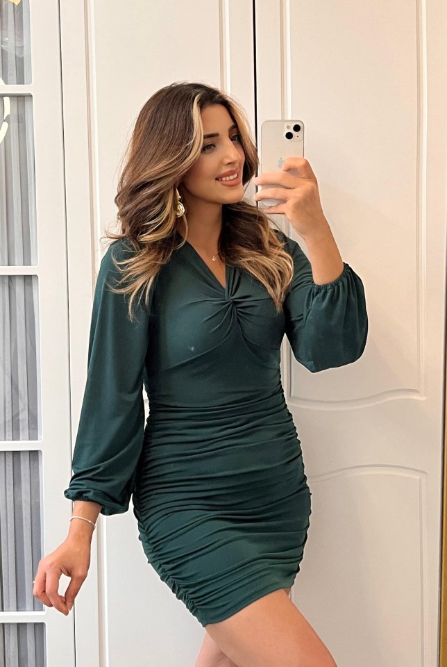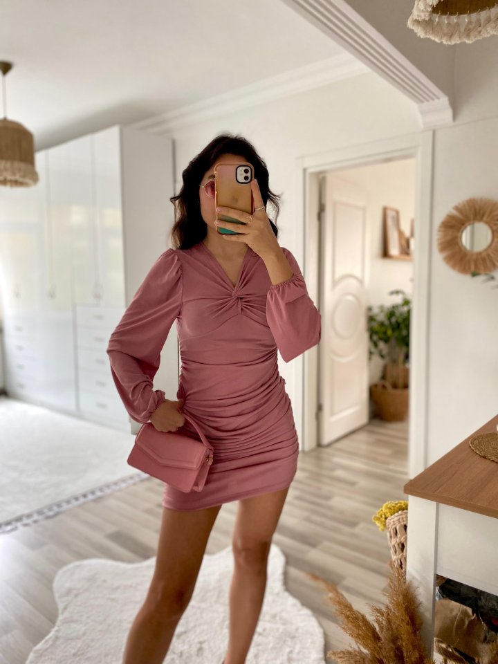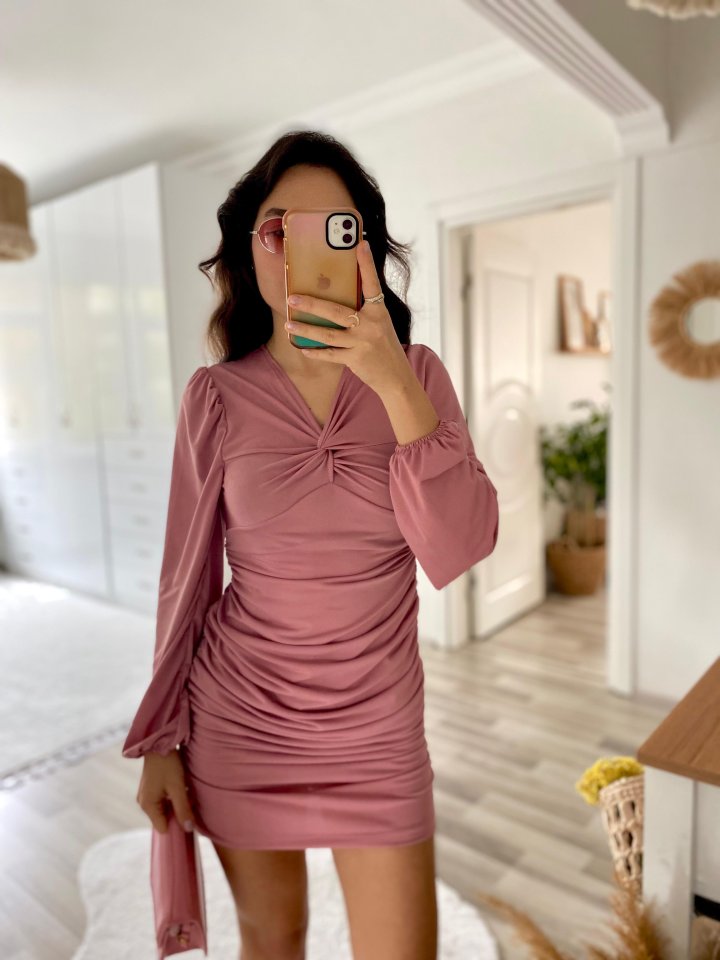 Kadın Uzun Kollu V Yakalı Yanlardan Büzgülü Kısa Sandy Elbise