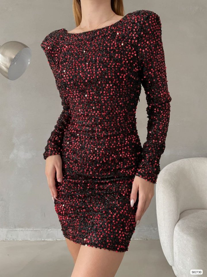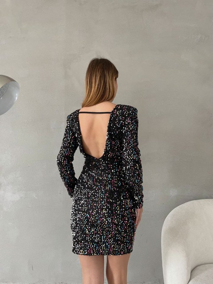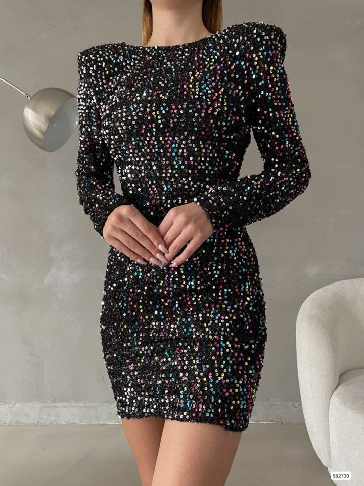Kadın Uzun Kollu Vatka Detay Full Pul Payet Mini Elbise
