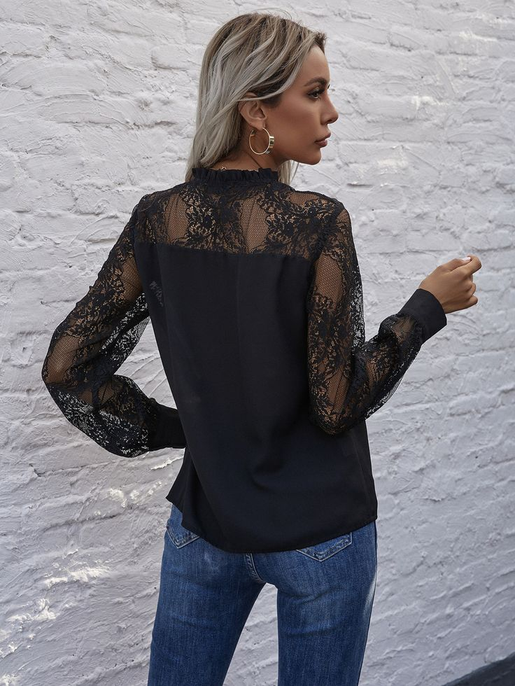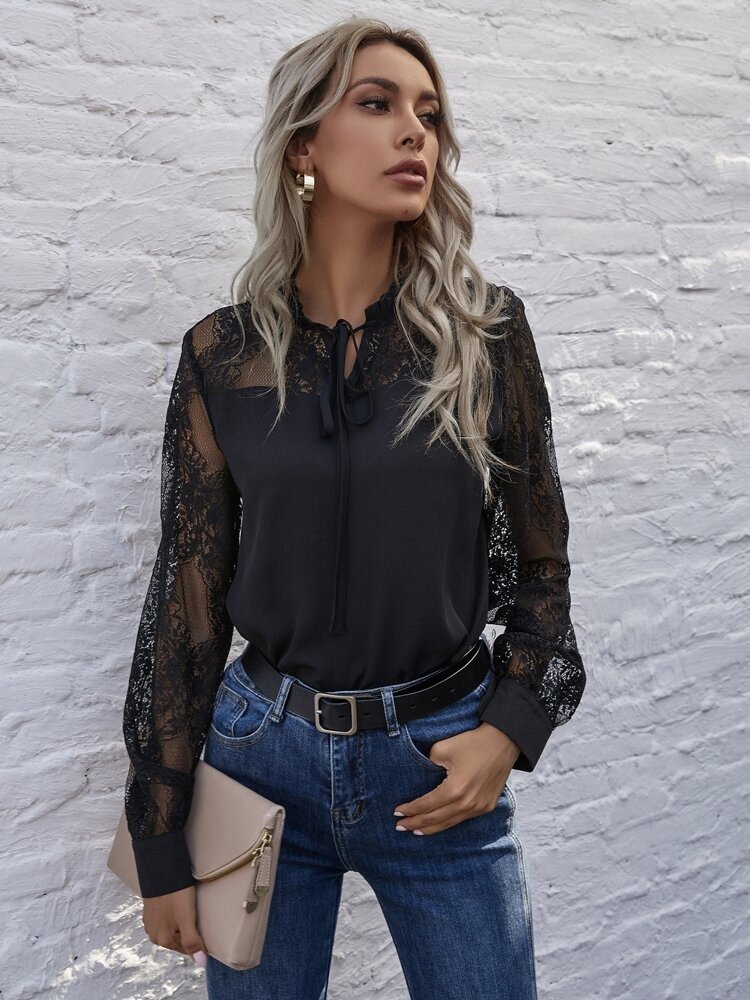 Kadın Uzun Kollu Yakadan Bağcıklı Dantel Detaylı Ithal Krep Bluz