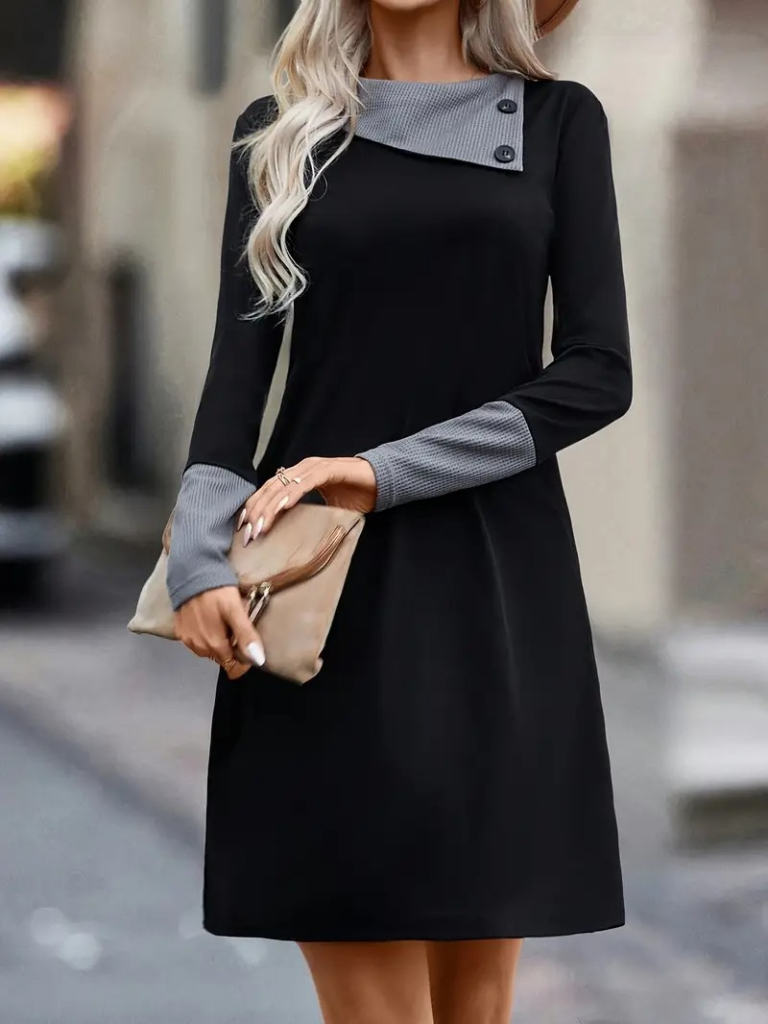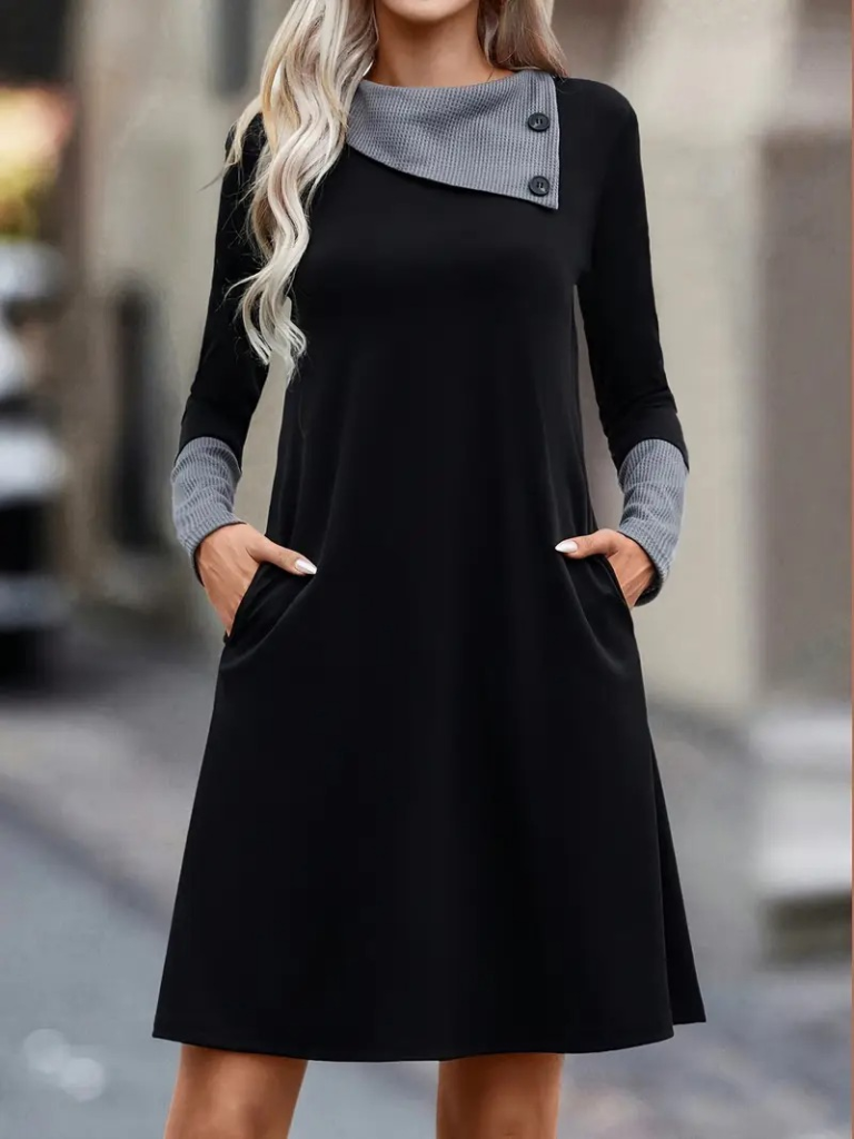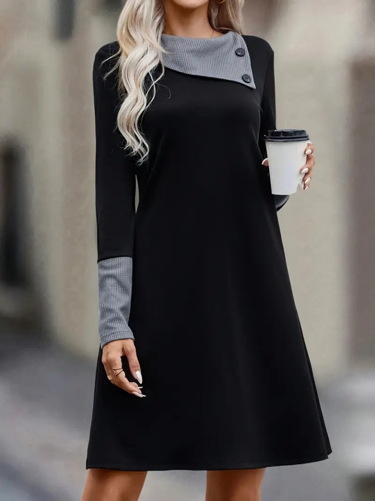 Kadın Uzun Kollu Yakadan Düğmeli Kısa Viskon Iki Iplik Elbise