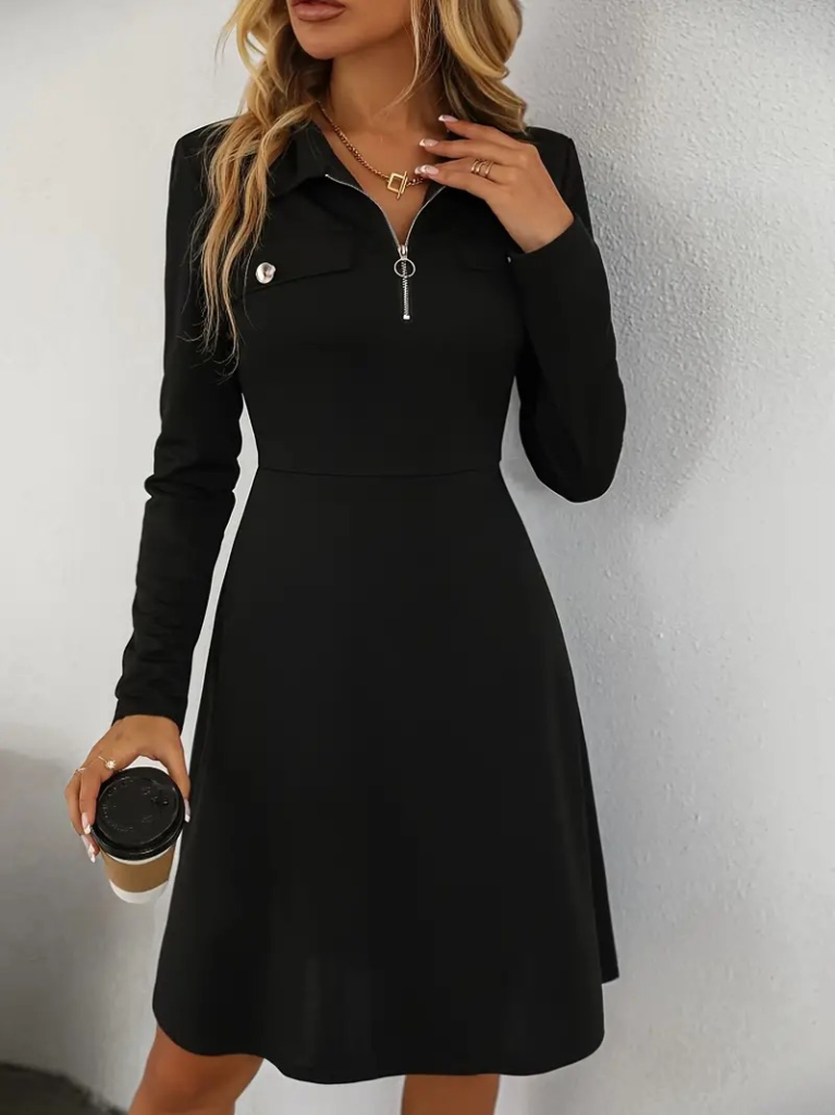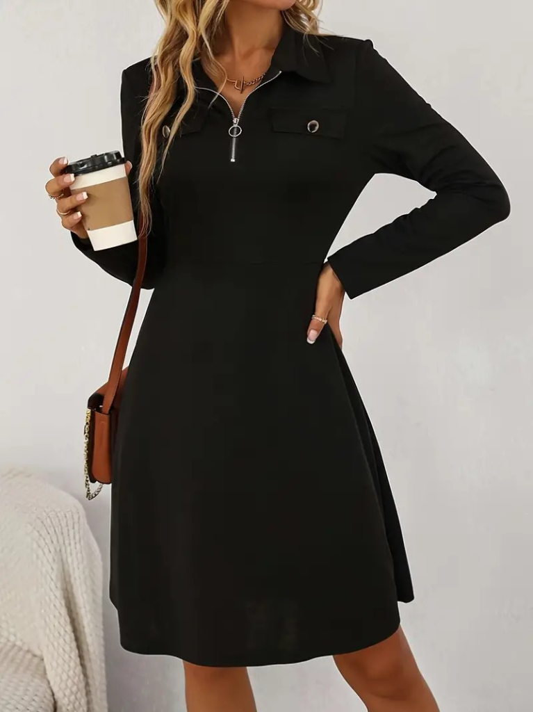 Kadın Uzun Kollu Yakalı Fermuarlı Ve Cepli Kısa Ithal Krep Kısa Elbise