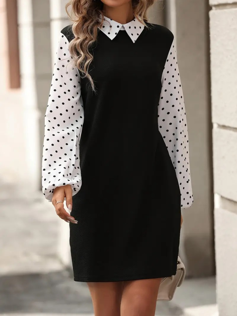 Kadın Uzun Kollu Yakalı Kol Ve Yaka Puantiye Detaylı Ithal Krep Elbise