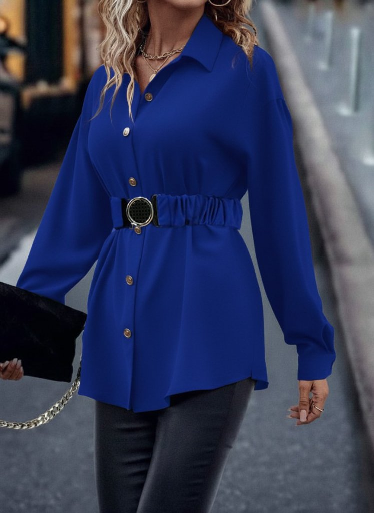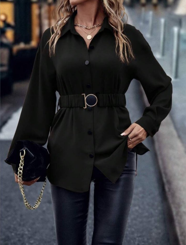 Kadın Uzun Kollu Yakalı önden Düğmeli Belden Kemerli Ithal Krep Bluz