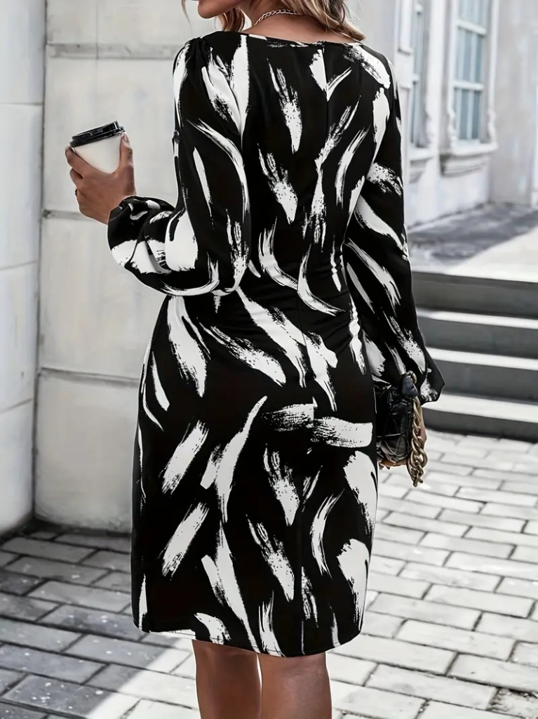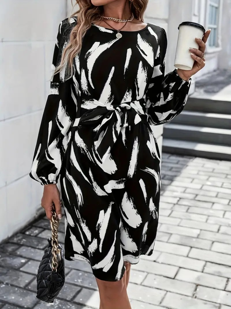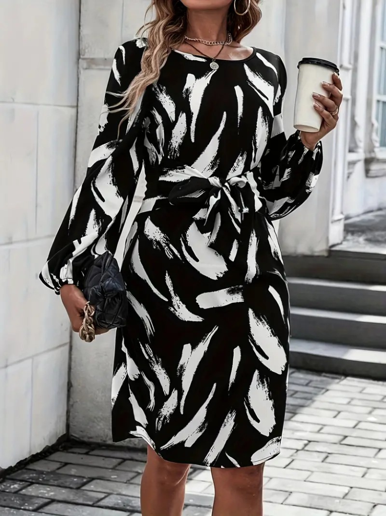 Kadın Uzun Kollu Yuvarlak Yaka Belden Kuşaklı Hazır Desenli Midi Krep Elbise