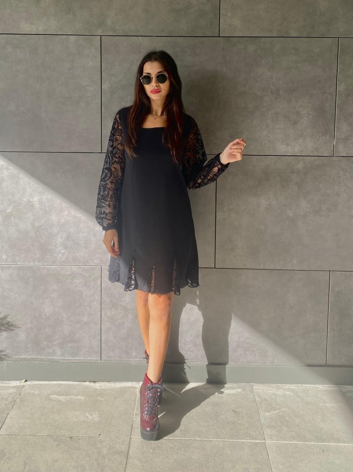 Kadın Uzun Kollu Yuvarlak Yaka Kol Ve Etek Ucu Dantelli Kısa Ithal Krep Elbise