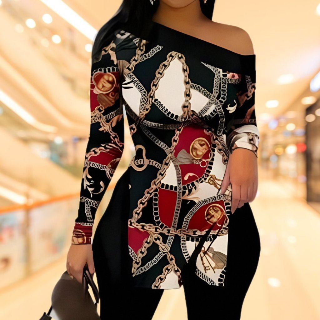 Kadın Uzun Kollu Zincir Desen Tek Omuz Düşük Mikro Bluz