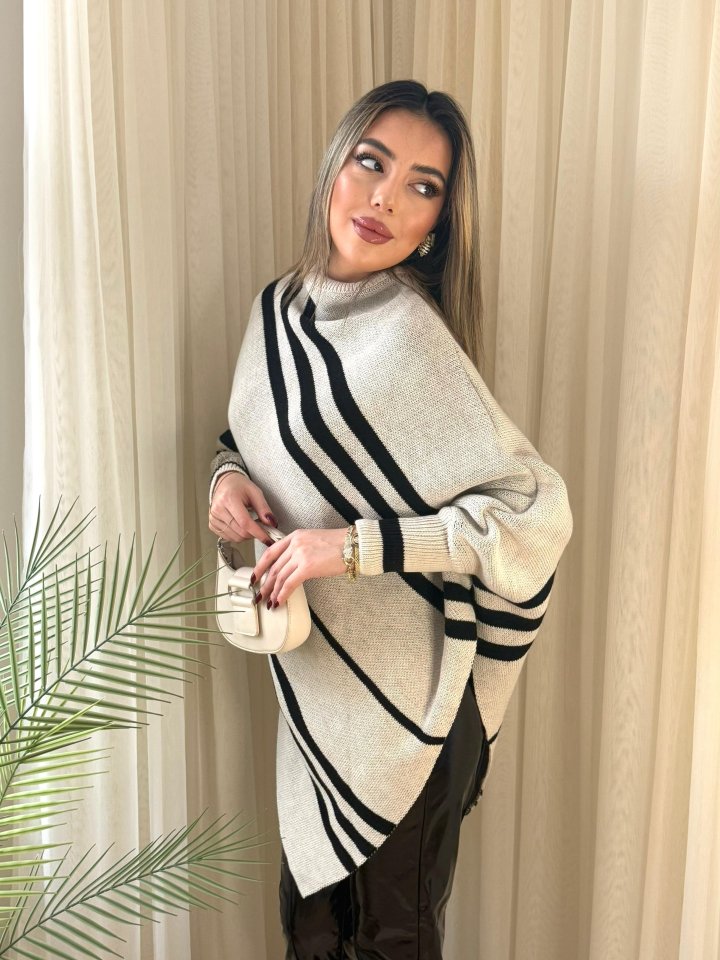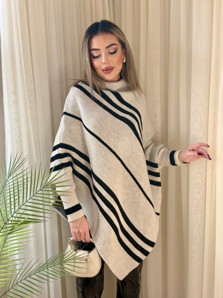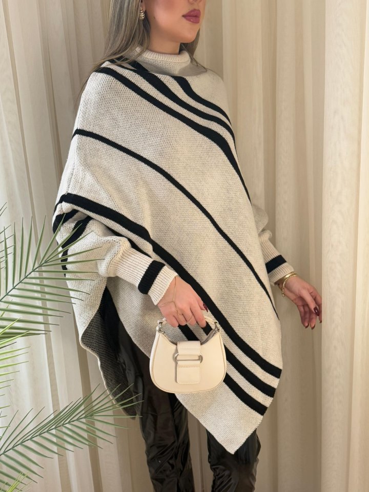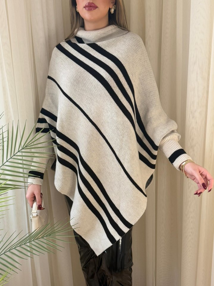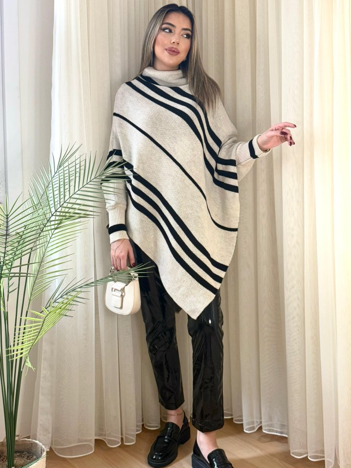 Kadın Uzun Yarasa Kollu Yüksek Boyunlu Asimetrik Kesim Triko Pelerin Kazak