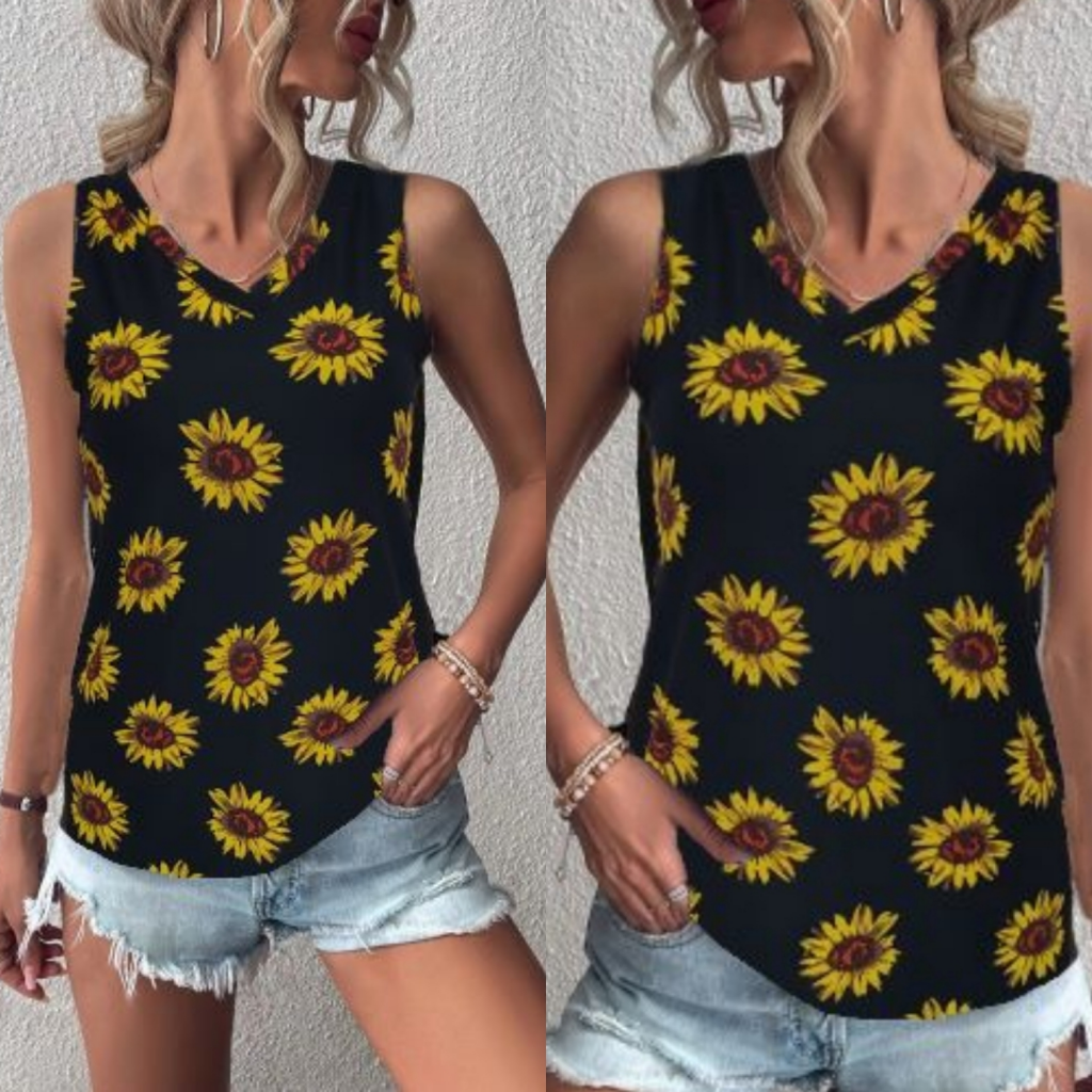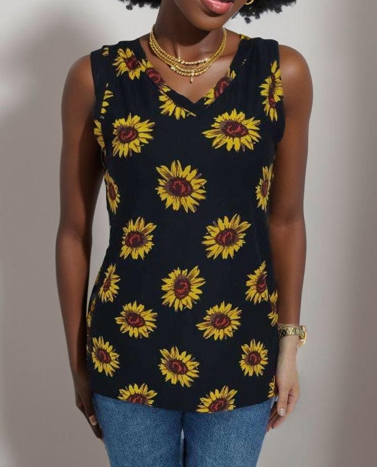 Kadın V Yaka Kolsuz Ayçiçeği Desen Krep Bluz